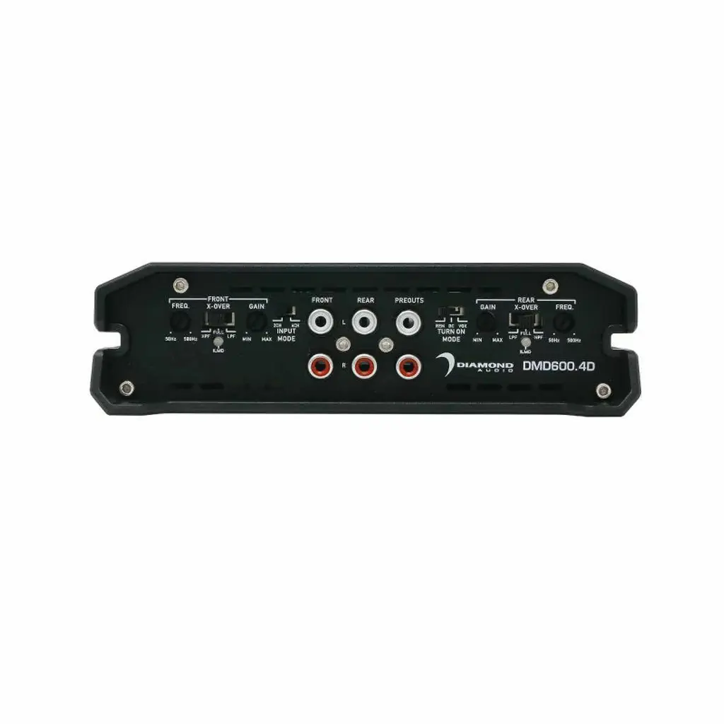 DMD600.4D – DMD Series 4-Channel Full Range Digital Amplifier Elevate your mobile audio experience with the DMD Series 4-Channel Amplifier by Diamond Audio. Offering top-tier performance and value, this amplifier is a compact powerhouse designed to enhance your vehicle's sound system without breaking the bank. The DMD Series boasts a range of amplifiers to suit your needs, including one 4-channel, three mono-channel, and one 6-channel option. These amplifiers are powered by cutting-edge IR chipset technology and feature innovative SMD technology and circuit design on 4-layer FR4 PC boards, ensuring high-quality performance in a small, efficient package. Benefit from noise-free operation thanks to balanced differential inputs, and enjoy customizable features such as a subsonic filter, bass boost, and an LED-lit logo indicating power/protection status. With rigorous audio precision quality control verification, the DMD Series guarantees unmatched performance and reliability. Enhance your audio setup with the DMD Series Amplifiers from Diamond Audio and discover the perfect combination of power, technology, and affordability. Upgrade your vehicle's sound system with these exceptional amplifiers and enjoy superior audio quality on all your journeys. Specifications: - 150W x 4 @ 2Ω - 100W x 4 @ 4Ω - 320W x 2 @ 4Ω (Bridged)
