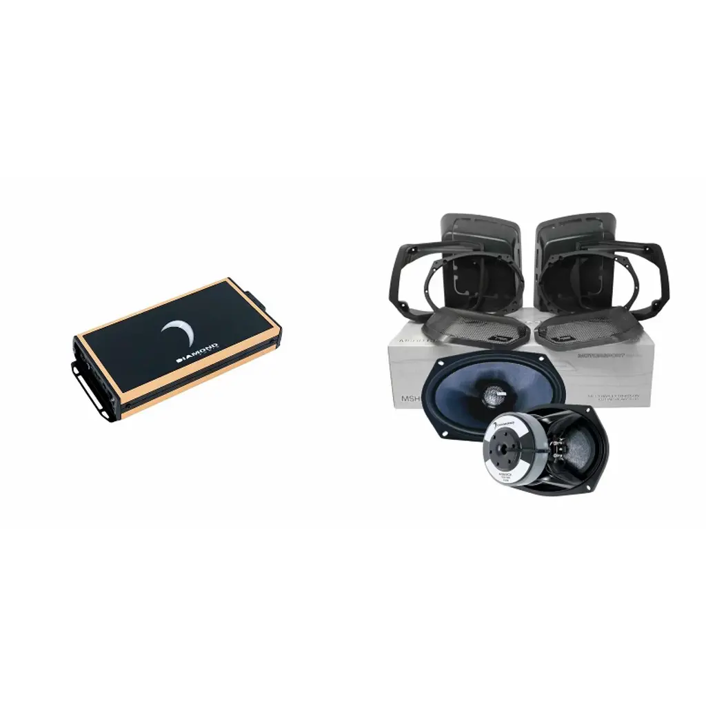 Upgrade your audio experience with this premium bundle that includes the Diamond Audio MICRO82U Microbu 2-Channel Amplifier, MSHD14 Plug N-Play Digital Media Receiver, and MSPRO65 Motorsport Pro Series Speakers. The MICRO82U offers 300W x 2 @ 2Ω, 200W x 2 @ 4Ω, and 600W x 1 @ 4Ω RMS Bridged power output, perfect for all-weather applications. With dimensions of 9.1” x 4.1” x 1.46”, this amp delivers exceptional performance and durability. The MSHD14 Digital Media Receiver boasts a 7" ultra-bright touchscreen, wireless Apple Carplay, and 10-channel clip-free independent outputs for a next-level audio experience on HD motorcycles from 2014 onwards. Enhance your ride with features like glove-friendly touch screen, waterproof construction, and Bluetooth 5.2 streaming. The MSPRO65 Pro Series 6.5" Speakers offer a powerful 200W RMS power handling, marine-grade compliance, and crystal-clear sound quality. With features like IP65 water-resistant construction, shorting ring motor structure, and UV-treated cloth surround, these speakers are engineered for far-field performance. Elevate your audio setup with this comprehensive bundle for the ultimate riding experience.
