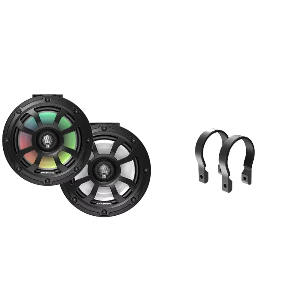 This bundle features the Diamond Audio CL225B RPM - 2.25" Clamp Ring in Black and the Diamond Audio POD10F4B - 10" 2-Way Marine Tower Speaker with Titanium Dome Tweeter. The Diamond Audio CL225B Clamp Ring set includes 4 black extruded aluminum rings with anodized finishing for enhanced durability. Equipped with rubber pads and UV resistance, these clamp rings are built to last in marine environments. The Diamond Audio POD10F4B Marine Tower Speaker boasts a 10" Kevlar cone and a high-energy neo motor system for powerful, clear sound. With a 1" Titanium Dome Tweeter and IP65 marine grade compliance, these speakers are designed to withstand sun, salt, and water exposure. Featuring 200W RMS/400W MAX Power Handling, these speakers offer high-performance audio in outdoor settings. The integrated RGB LED lighting creates a customizable ambiance, perfect for various environments. The stainless steel mesh grills provide both elegance and speaker protection. With a rugged design and top-notch components, Diamond Audio's marine speaker pods set a new standard in marine audio. Perfect for marine or all-terrain use, these speakers deliver exceptional audio quality even in challenging outdoor conditions. Choose Diamond Audio for an unparalleled audio experience on the water.