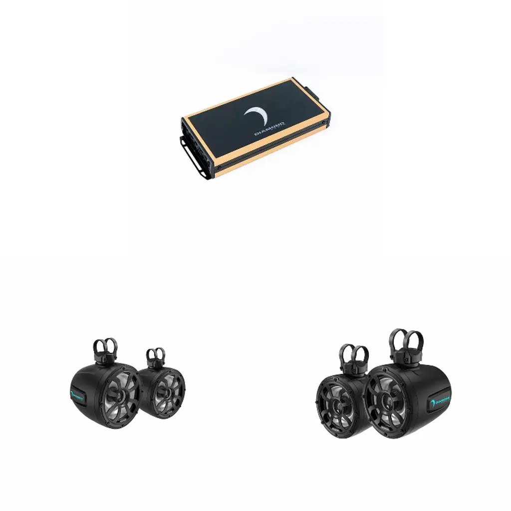 This bundle packs high-performance audio gear perfect for marine, all-terrain, and outdoor setups. The Diamond Audio MICRO84U Amplifier delivers 250W x 2 @ 4Ω bridged power in all-weather applications. With dimensions of 9.1” x 4.1” x 1.46”, it's versatile and powerful. The Diamond Audio POD65F4B brings a 6.5” speaker pod with titanium dome tweeter, boasting 150W RMS/300W MAX power and IP65 marine grade compliance. The 10” Diamond Audio POD10F4B speaker pod offers 200W RMS/400W MAX power with RGB LED lighting for a dynamic visual experience. Lastly, the Diamond Audio BTR8 Bluetooth Controller & Receiver, with Bluetooth 5.0, is water-resistant and perfect for outdoor use. The 5-way axial control knob and RCA output offer easy connectivity. Upgrade your audio setup with this bundle and enjoy top-notch sound quality and durability in any environment. Perfect for marine, outdoor, and all-terrain applications, immerse yourself in unparalleled audio experiences with Diamond Audio's exceptional products.