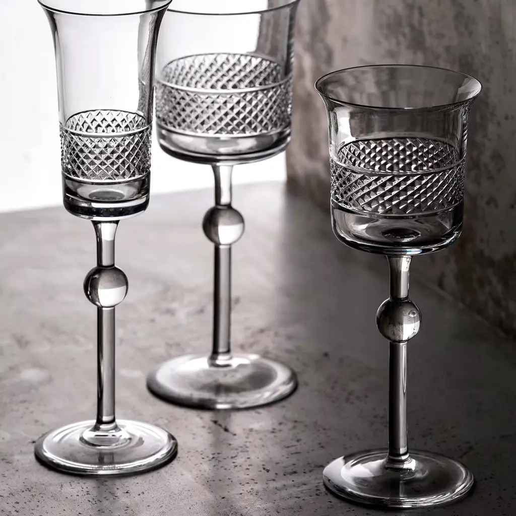 This exquisite set of two champagne goblets is part of the Diamond collection, distinctive for a striking diamond-shaped decoration on the bowl. Timeless and sophisticated, this design from 2004 by Claire Le Sage expresses Arnolfo di Cambio's harmonious balance of traditional and modern styles, superbly crafted of mouth-blown crystal by the hands of master glassmakers. This is a splendid way to celebrate a special occasion. Each piece is H227 mm and Ø62 mm, and has a capacity of 12 cl.