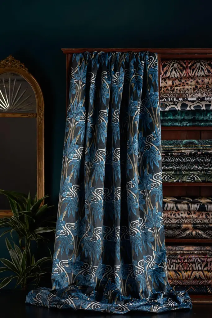 Dianne is a sandwiched print of two of Anna’s linocuts, pieced together to form a lyrical, jungle-like design which lends well to maximalist schemes. With a hint of Art Nouveau influence, this lush blue and green colourway sits well with monochrome and metallics, and of course, bohemian style plant-filled rooms.This velvet is midweight, with a strong straight woven backing, so is suitable for upholstery, but is also light enough for curtains and cushions.140cm widePattern repeat 25cm wide and 18cm high100% polyester50’000 rub countDry clean onlyWeight 345 grams per square metre Please note our velvets are not naturally fire retardant. FR and CRIB 5 treatment available upon request. The cost for FR and CRIB 5 treatment is an additional £6/metre.Delivery time – This fabric is printed to order and dispatched directly from our print partner, within approximately 2 weeks. If you have a particular deadline do let us know. Fabric is shipped on rolls. Samples are available on request for a cost of £2.00. Samples are approximately A5 size and are available for immediate dispatch.