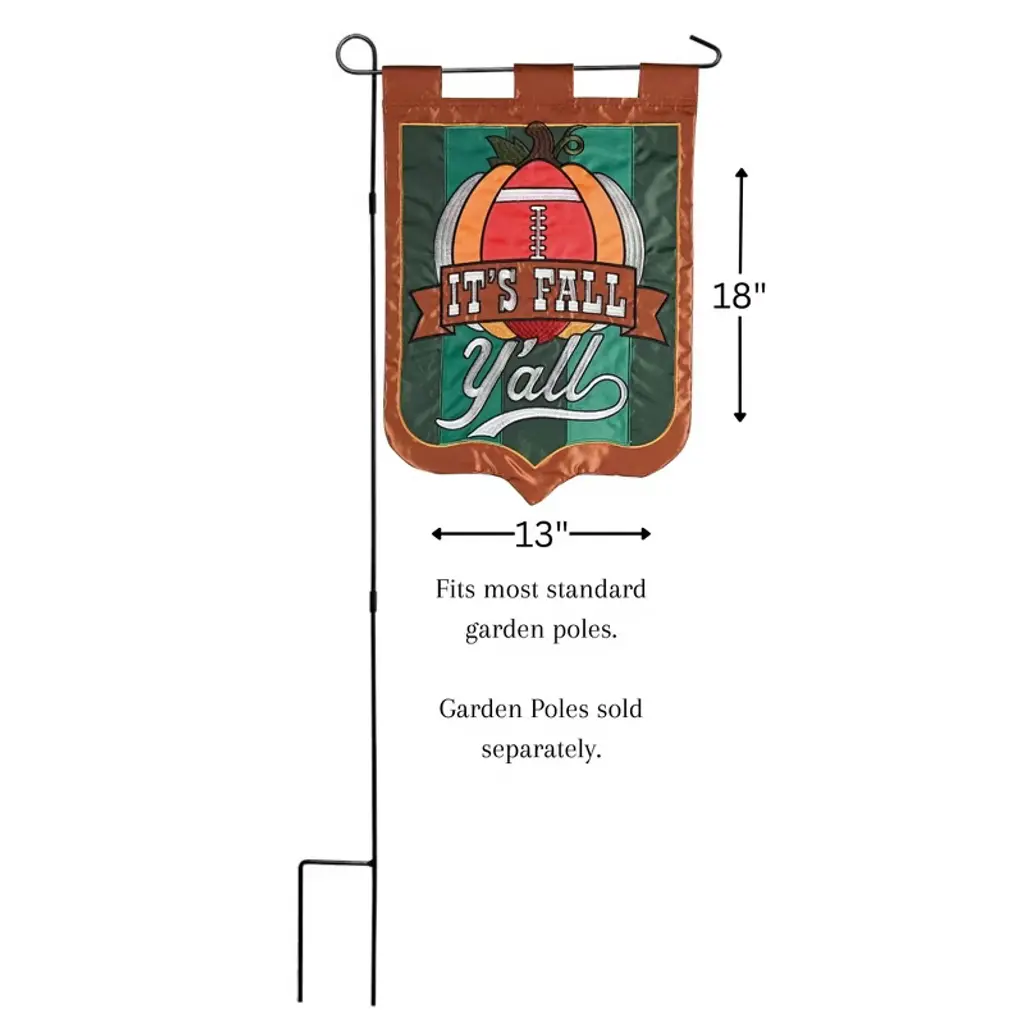 These decorative garden flags that are designed with a mixture of double applique fabrics and exquisitely detailed embroidery are the perfect way to celebrate this season; Features a football pumpkin and reads 'It's fall y'all'. Crafted from 300 Denier Polyester which is heavier and more durable than most others on the market; Double applique fabrics are either satin-smooth or a burlap texture, sometimes a combination of both. Standard flag measures approximately 13 x 18 inches; Double sided design for viewing at any angle. Flag is rainproof and will retain it's beauty for years if displayed in shade or semi-shade; Flagpole sold separately. Contained in protective packaging; Ready for easy gifting for any celebration