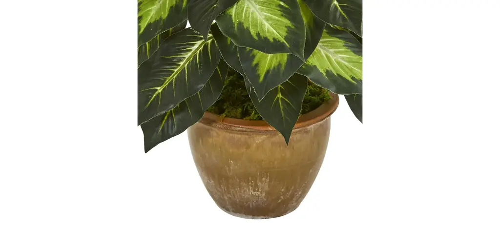 Differing in size, the variegated leaves of the Dieffenbachia Artificial Plant in Ceramic Planter are arranged with the largest leaves standing straight up above the smaller foliage that surrounds them. With a ceramic pot topped with natural moss included, The rich color of the multi-hued leaves will bring some much needed greenery into your living room, loft, or study room.
