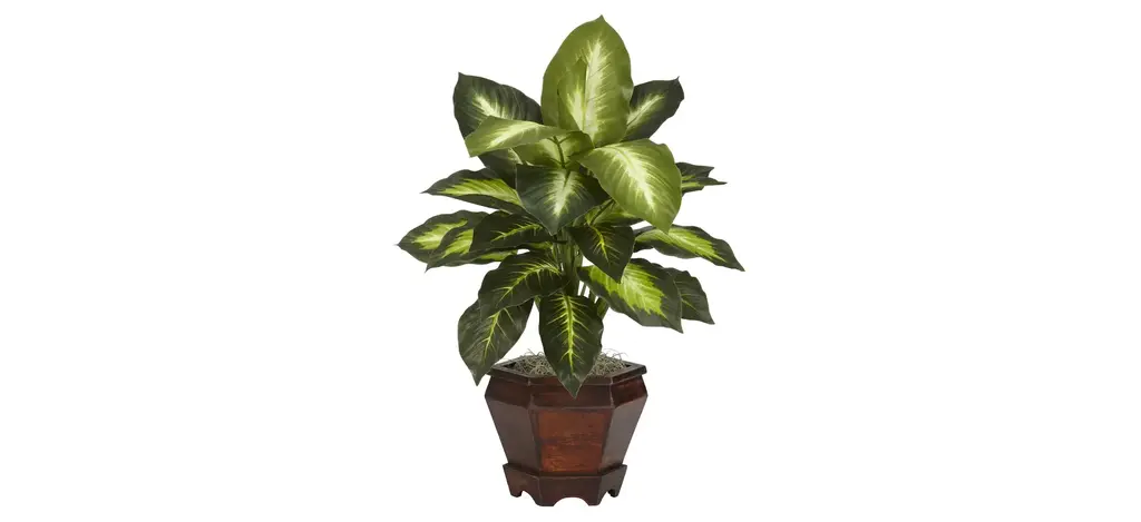 The bold leaves that make up these Dieffenbachia with Wood Vase Silk Plants are "large and in charge", and are coupled with an equally impressive planter. The sharp contrasts of the two-tone leaves will definitely draw the appreciative plant lover's eye from anywhere in a room. Arrives with two pieces.