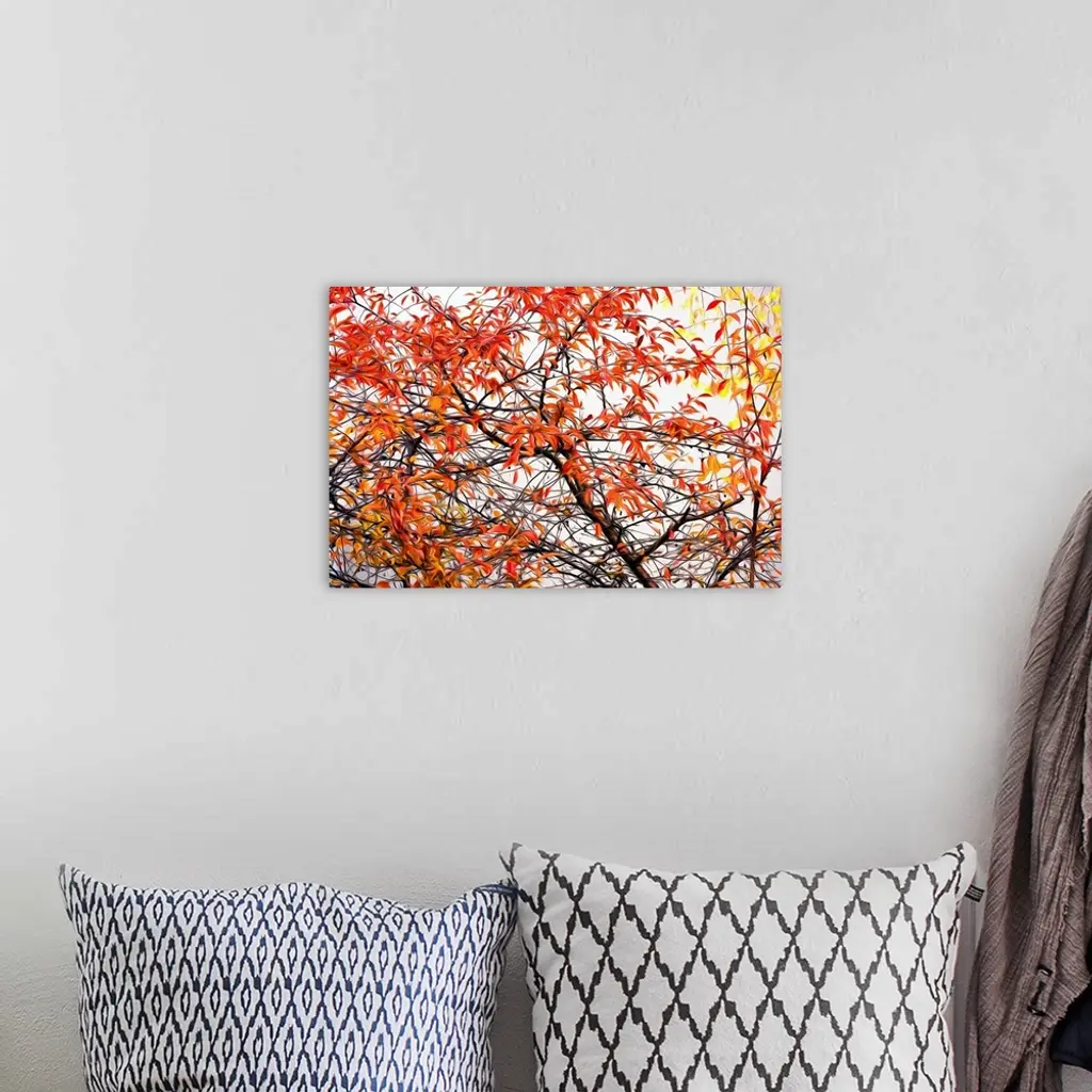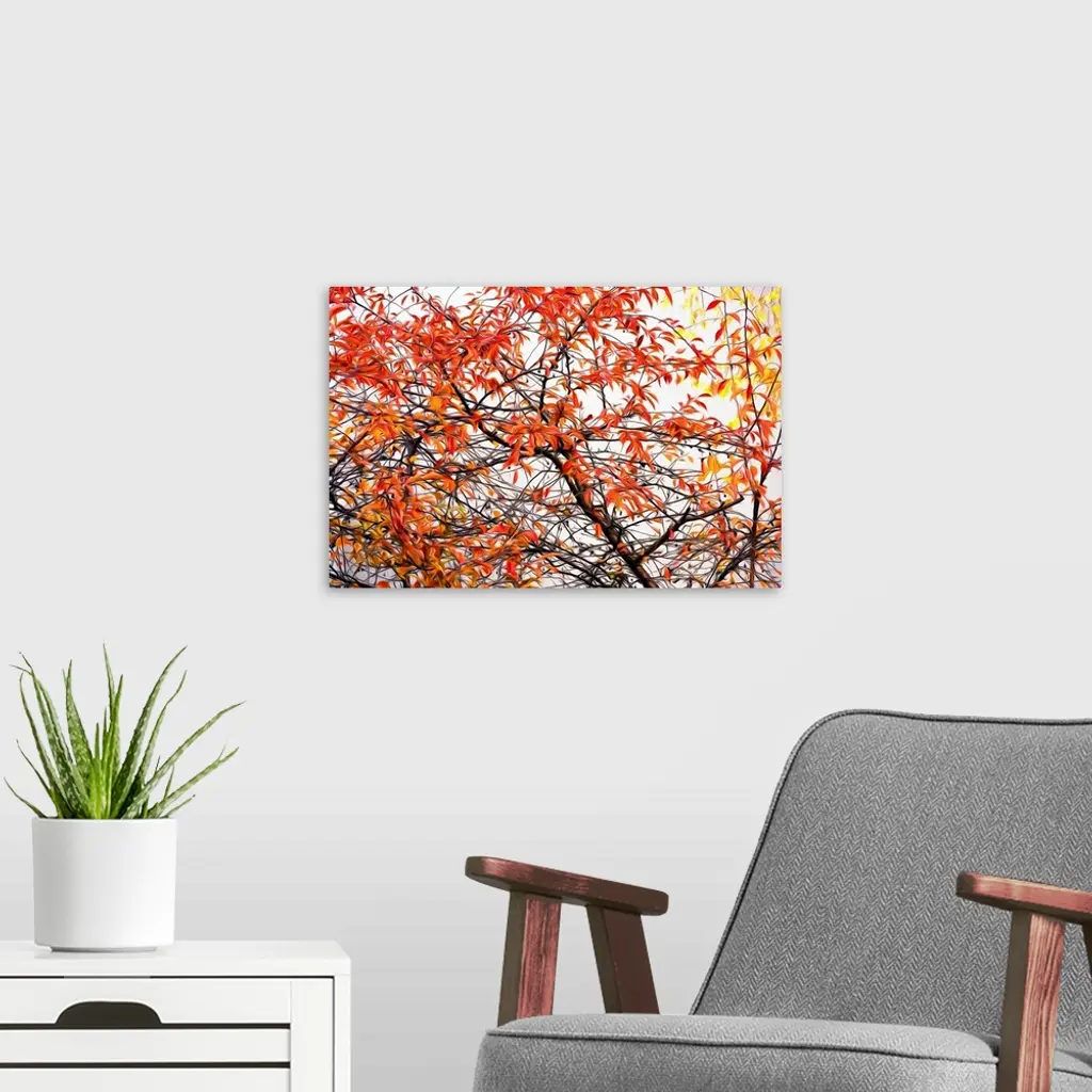 Image of red, orange, and yellow Autumn leaves on a tree with a painted effect.