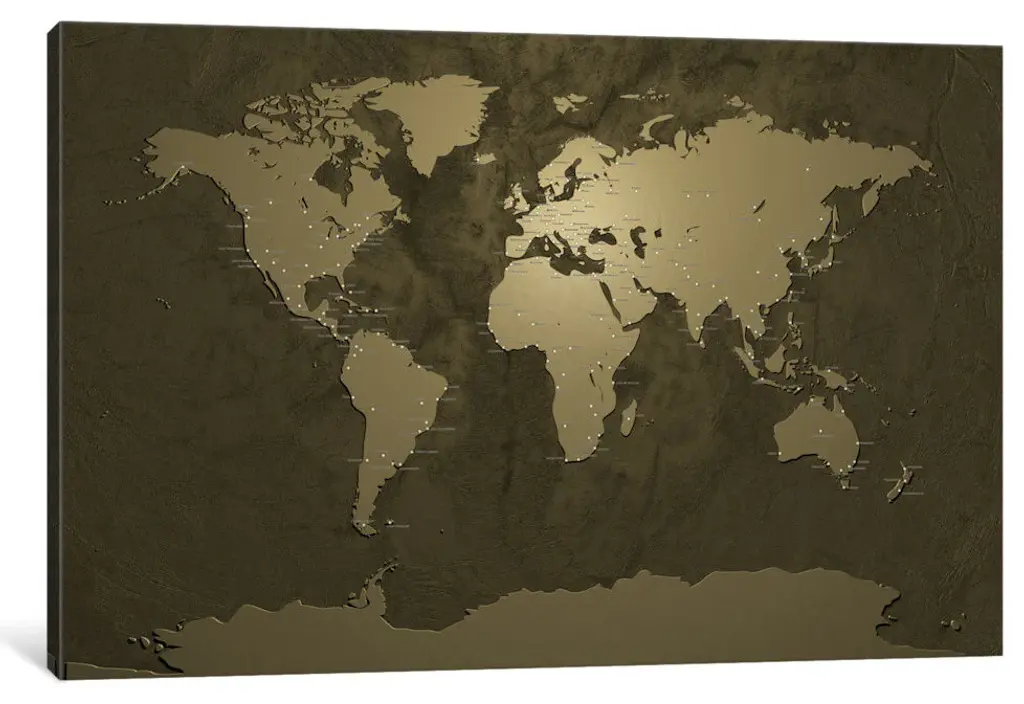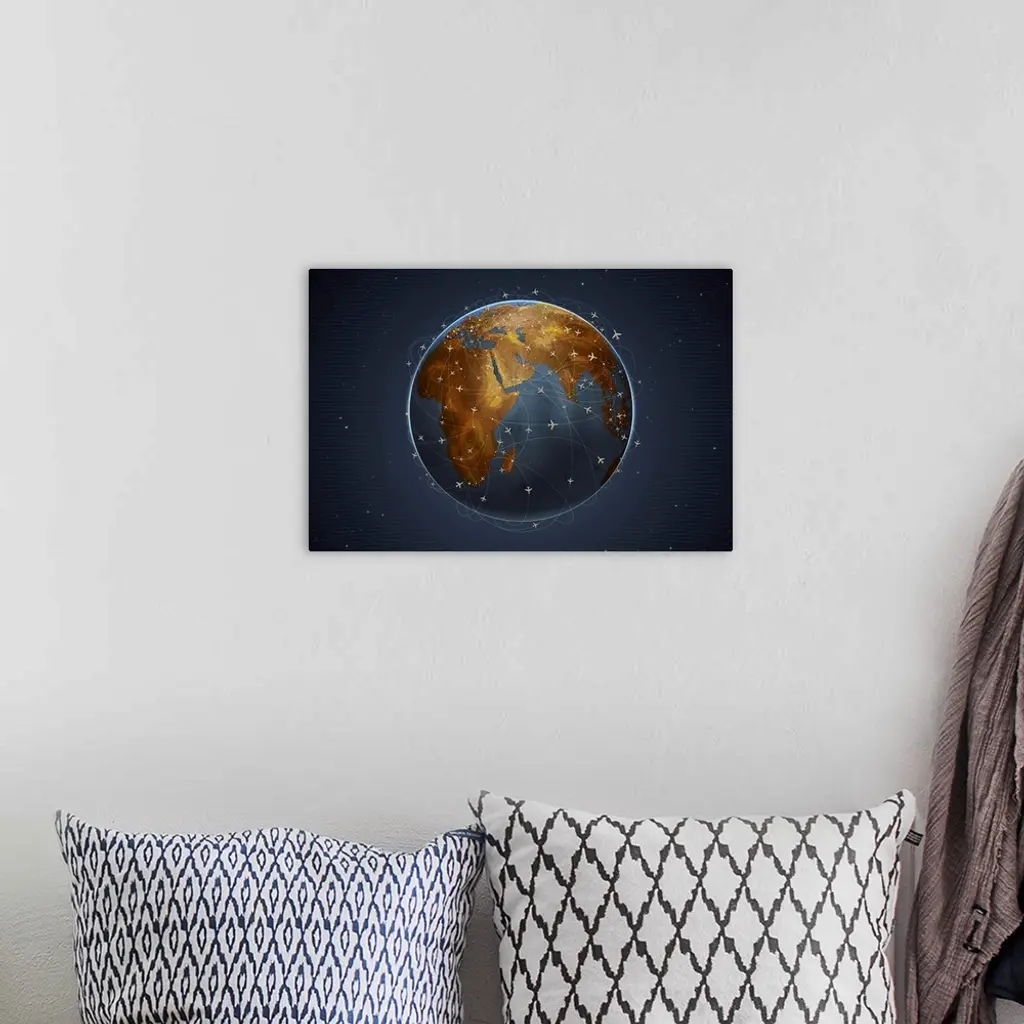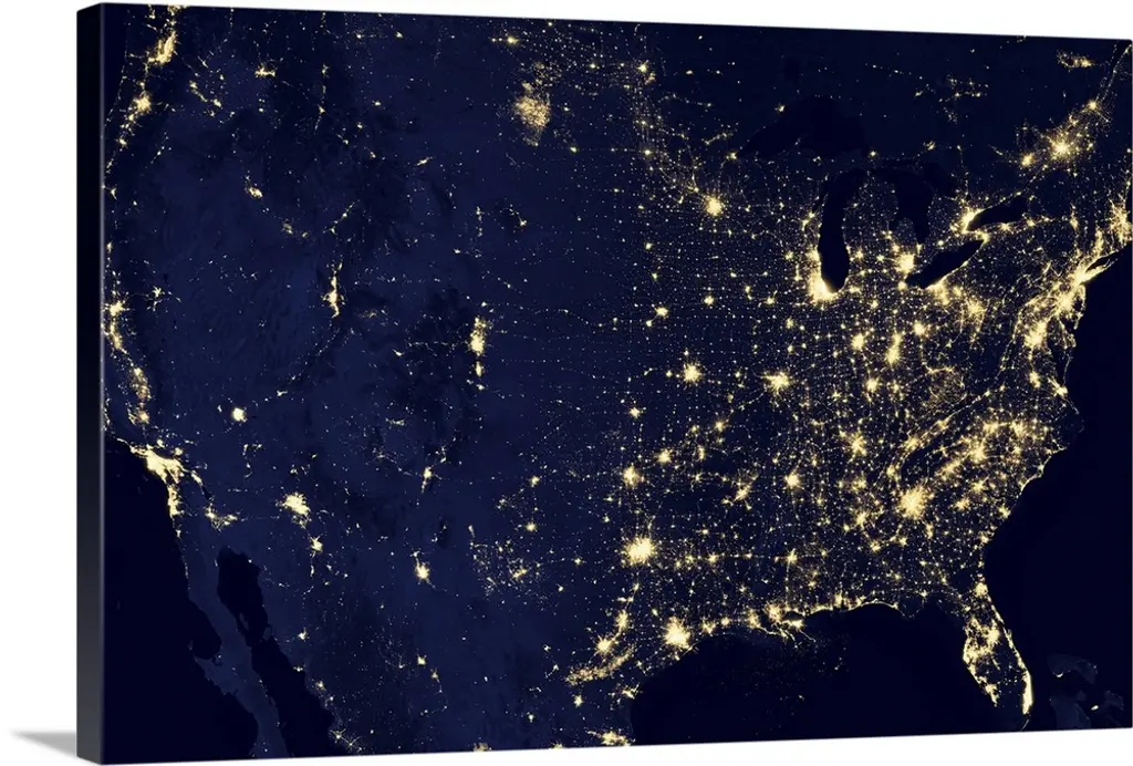 City lights (yellow) of increasing intensity show areas of increasing population, with areas of few lights being more sparsely populated. Image obtained using data from Landsat 5 and Landsat 7 satellites in this wall art for the home or office.