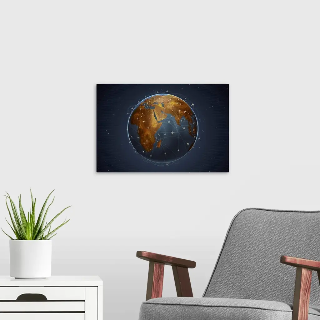 Digitally Generated Image Of Airline Flight Paths Around The Globe