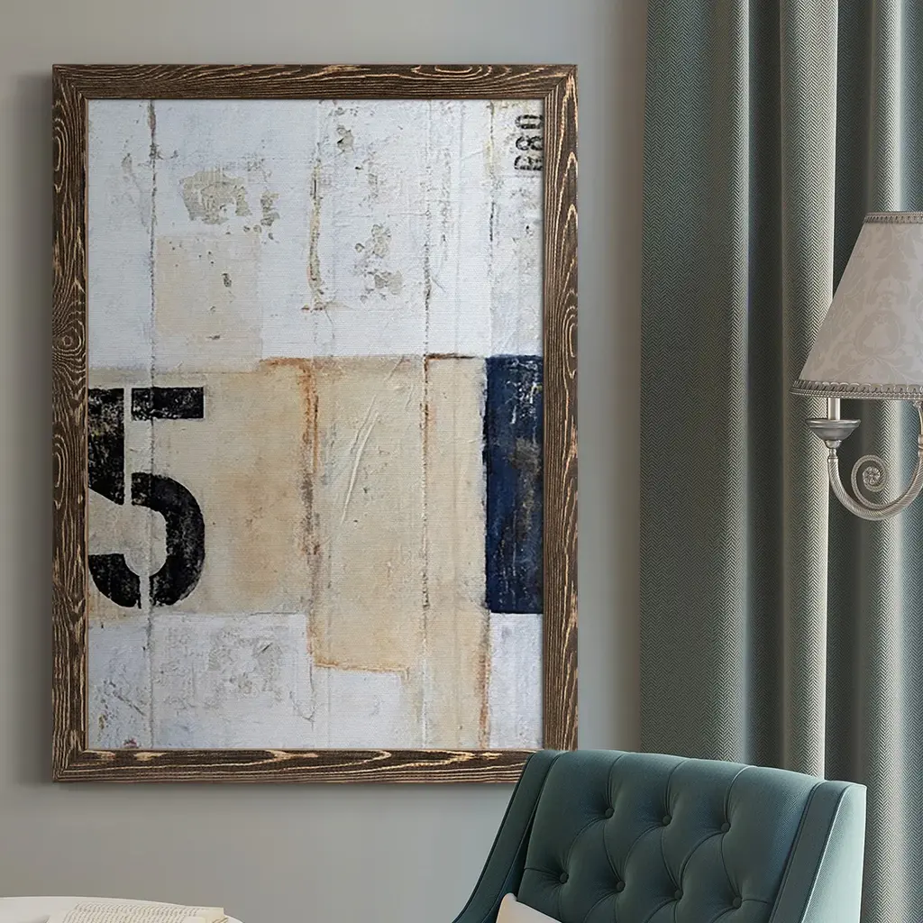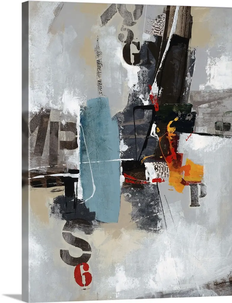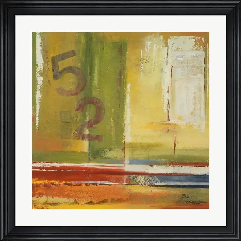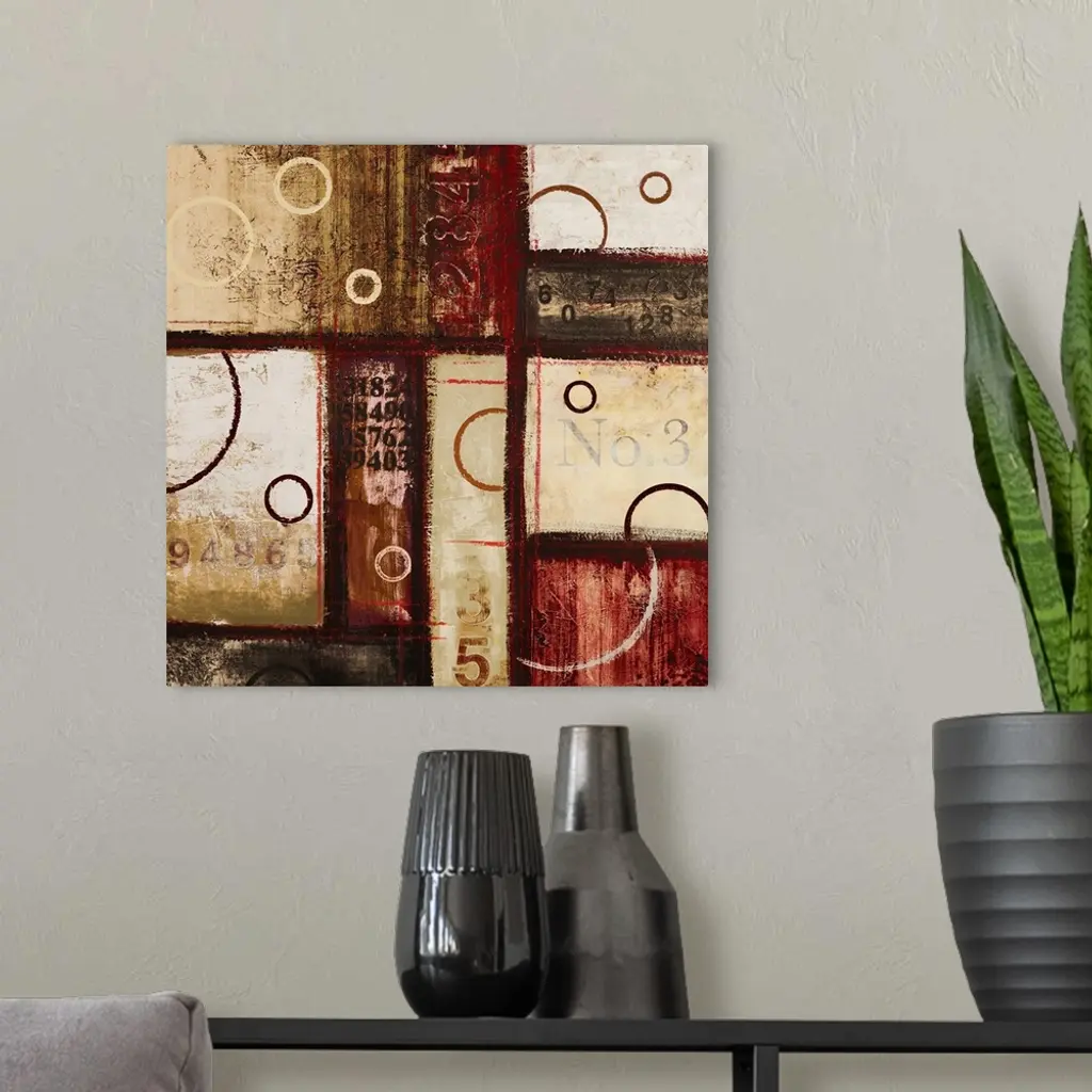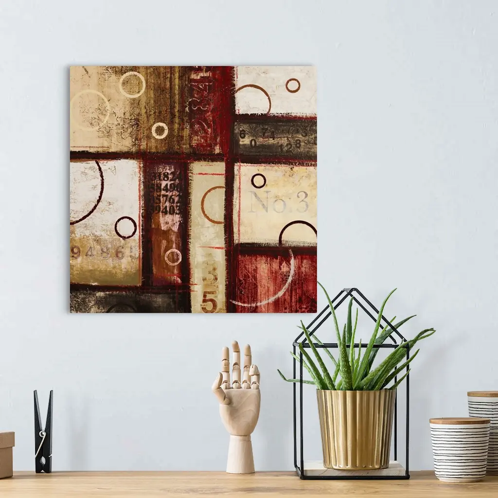 Contemporary abstract art of blocks and circles of dark colors laid overtop of digital numbers.