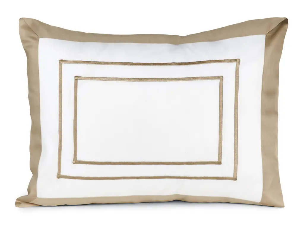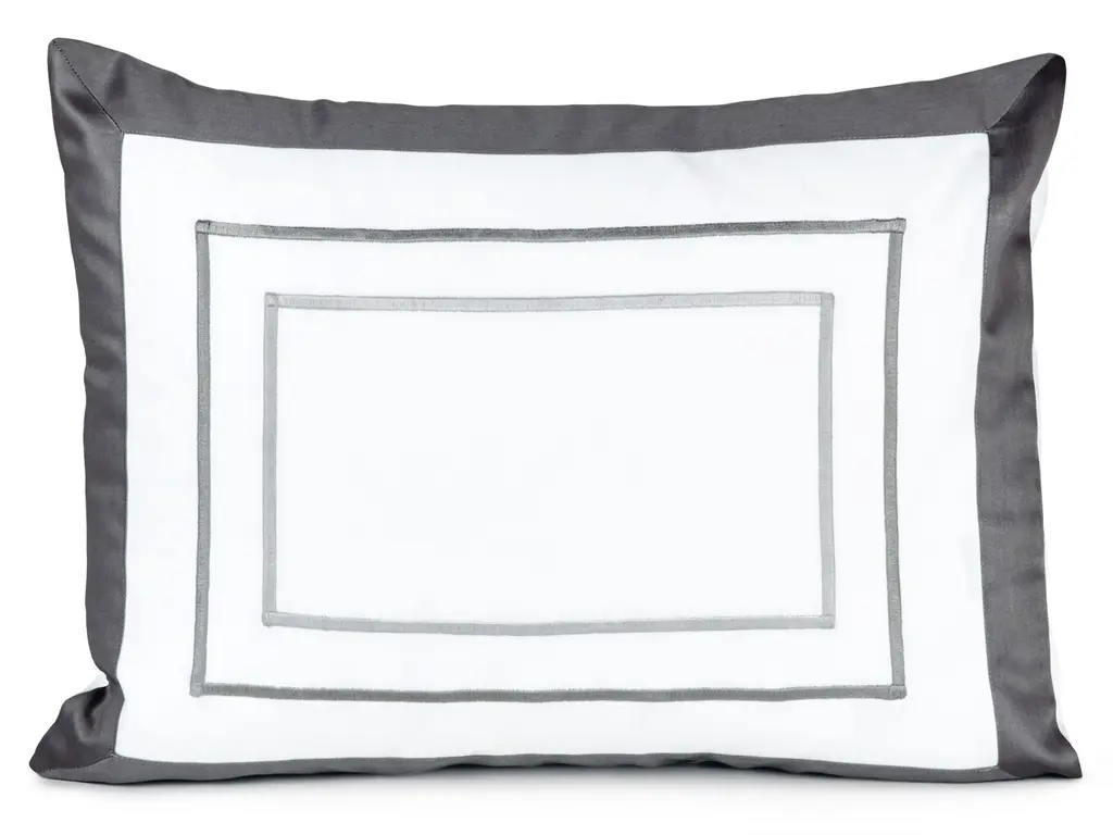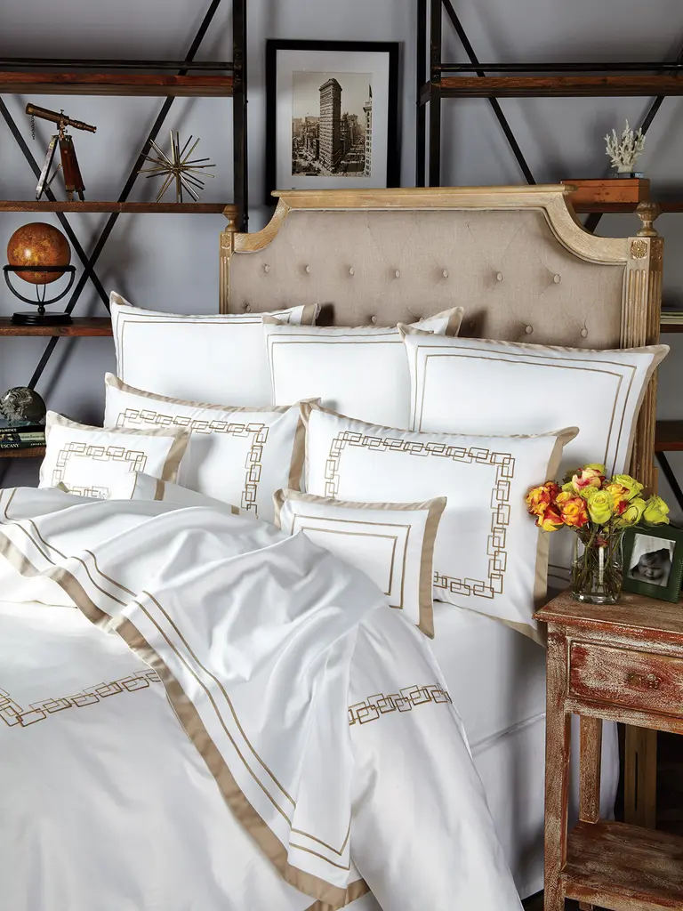 Whether you’re looking to upscale, up-grade or totally reinvent your bedroom, this contemporary chic style will add an entirely different dimension of detail and color to your decor. Embroidered on a pristine 300 thread count Egyptian cotton sateen, the taped borders and zen embroidery create a calming focus, inspiring balance in body, mind and spirit. Available in two shades of Gray or two shades of Beige. Made in Italy.