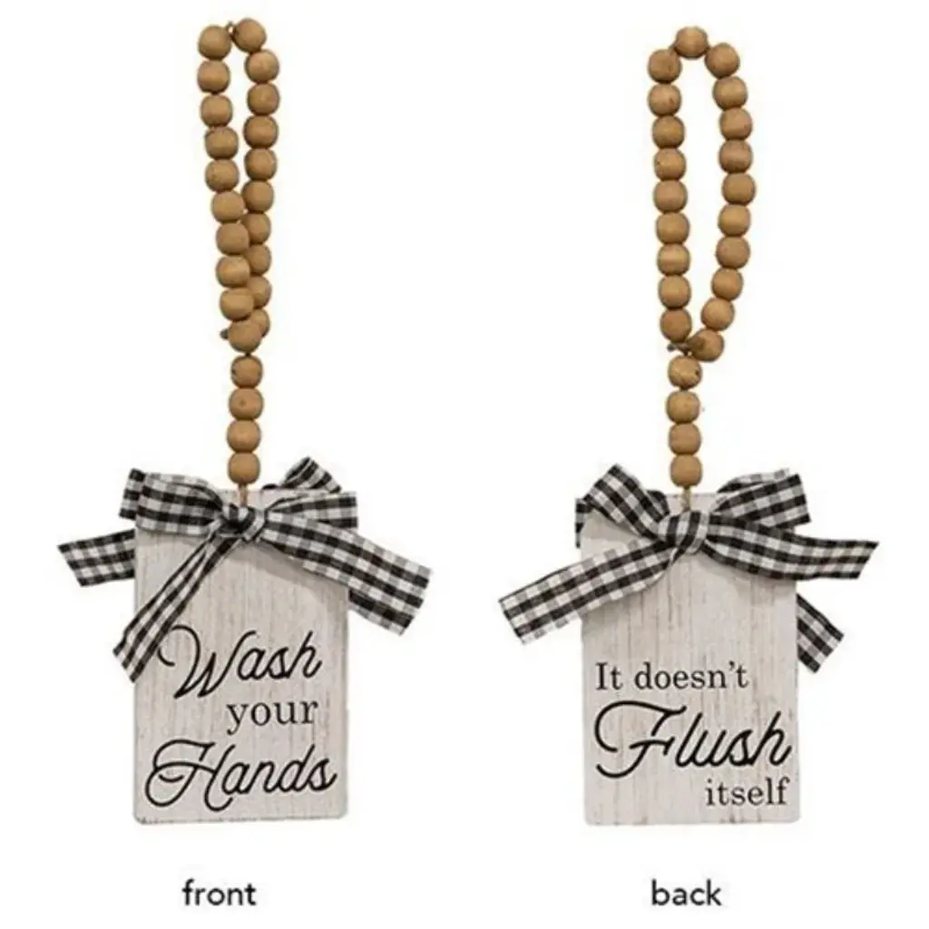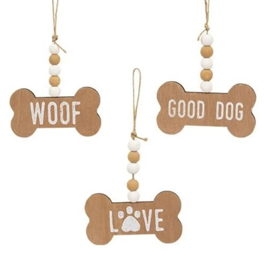 This is an assortment of three wooden tag ornaments featuring etched scripted lettering and a wine theme. One tag reads “wine not?”, the second tag reads “mommy’s special juice”, and the third tag reads “dinner is poured”. Each tag includes a jute rope loop, strung with two wooden beads, attached to the top for a hanging display.