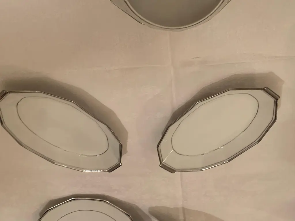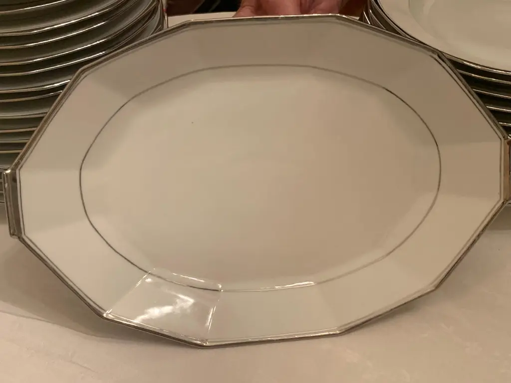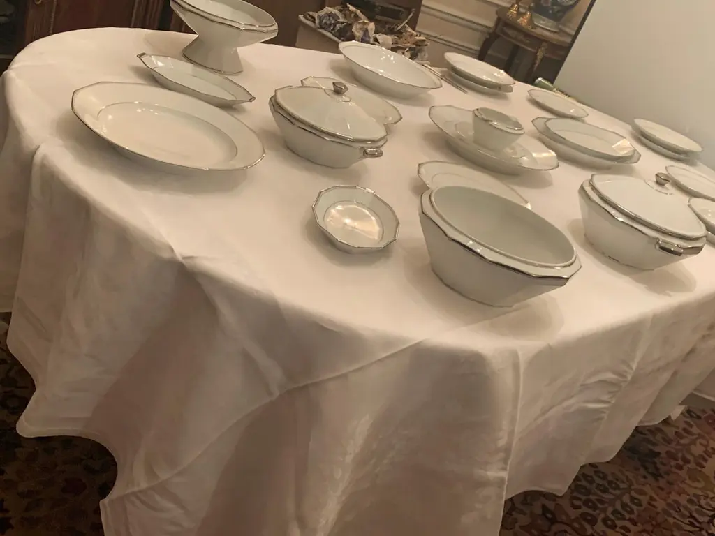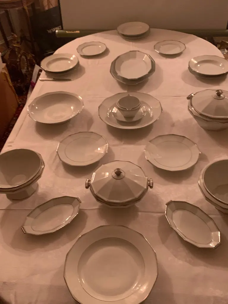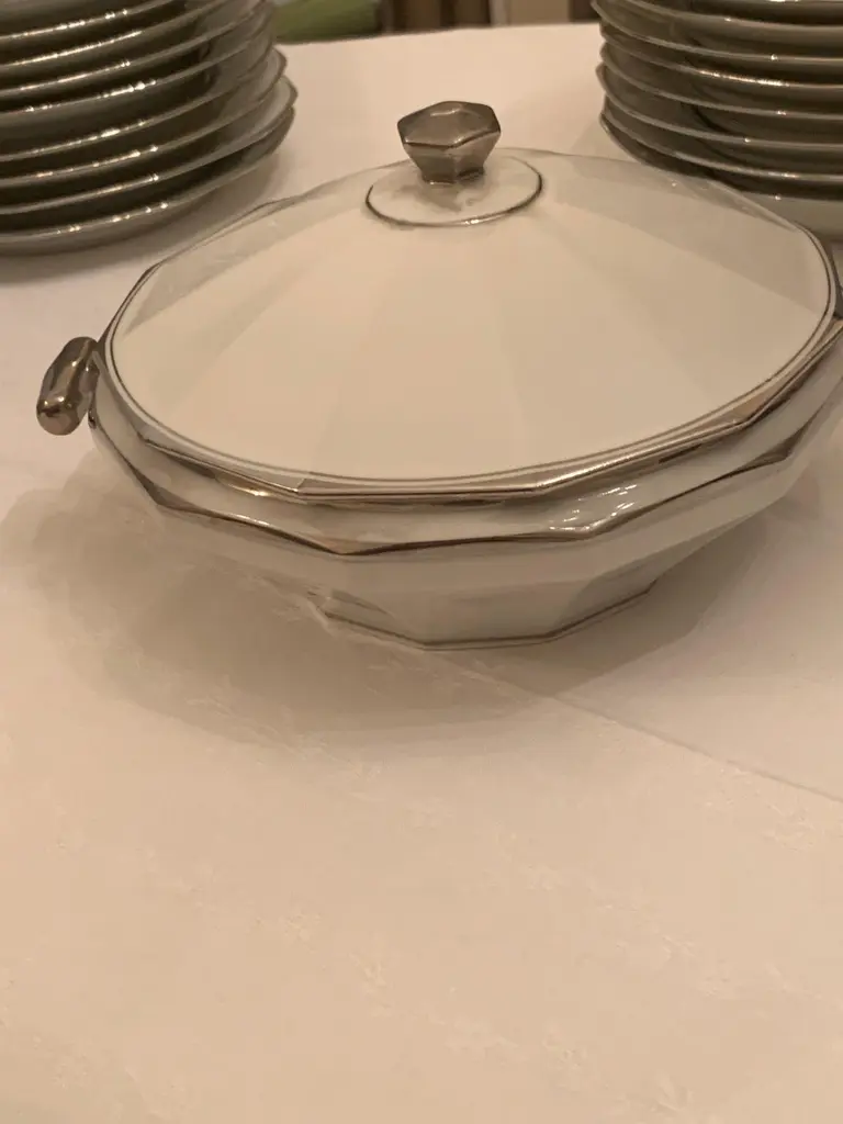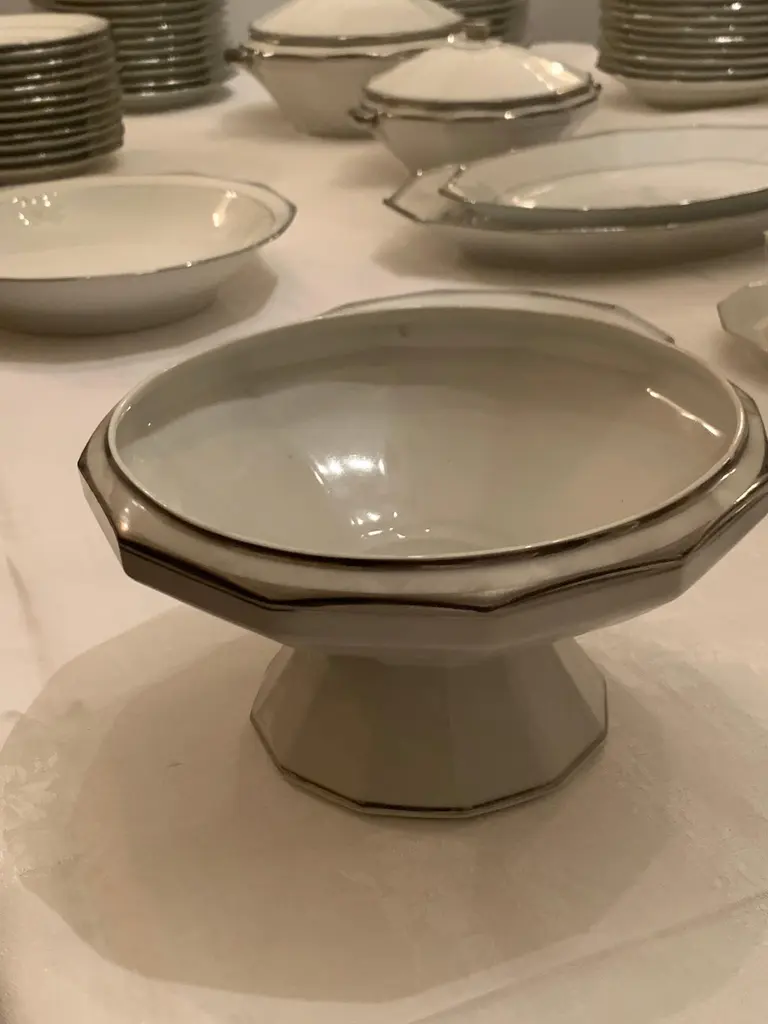 Very beatifull Limoges porcelain dinner set in the modern style comprising 73pieces,it is a dinner set for 12 peoples ,all the plates , dishes,and shapes pieces are all decorated with a silver-colored border 12 soup plates ,12 dessert plates, 36 large plates,1 soup tureen,1 vegetables bowl,1 saladbowl,2 serving dishes,2 display stand, 1 sauce boat,2 serving dishes, 1 display dish, 2 display dishes