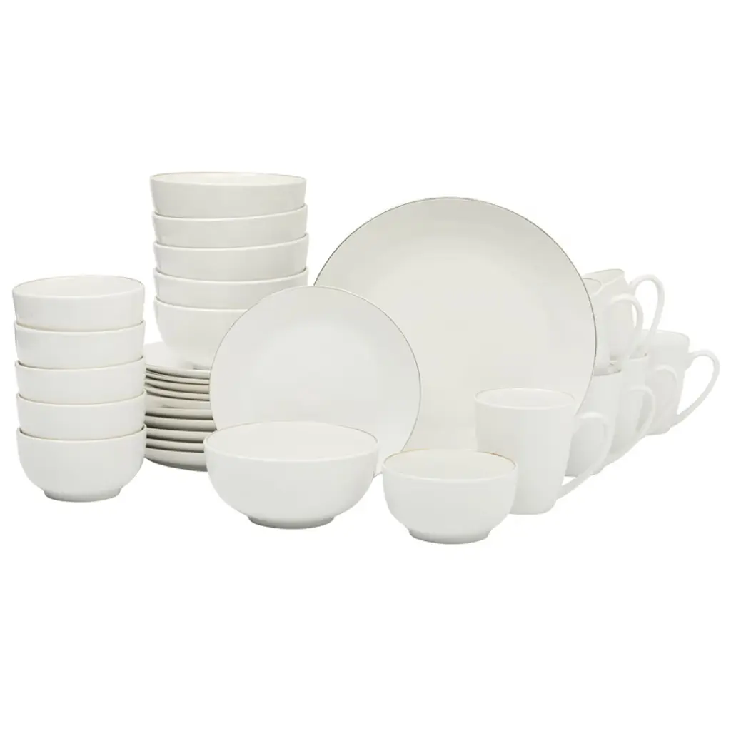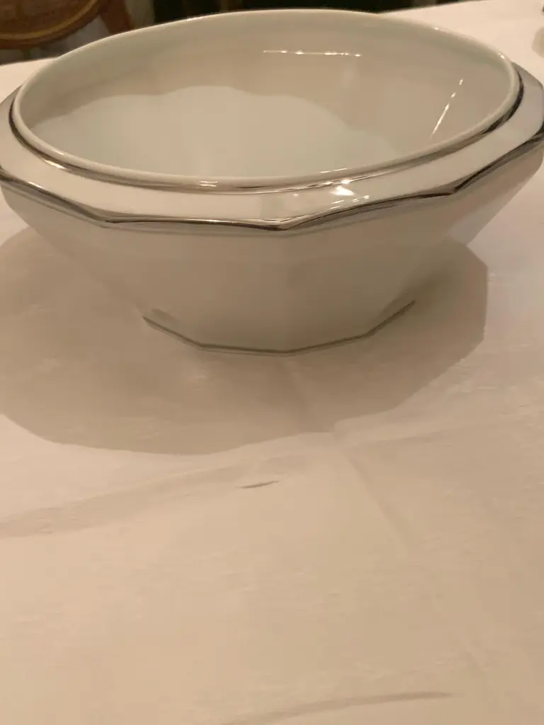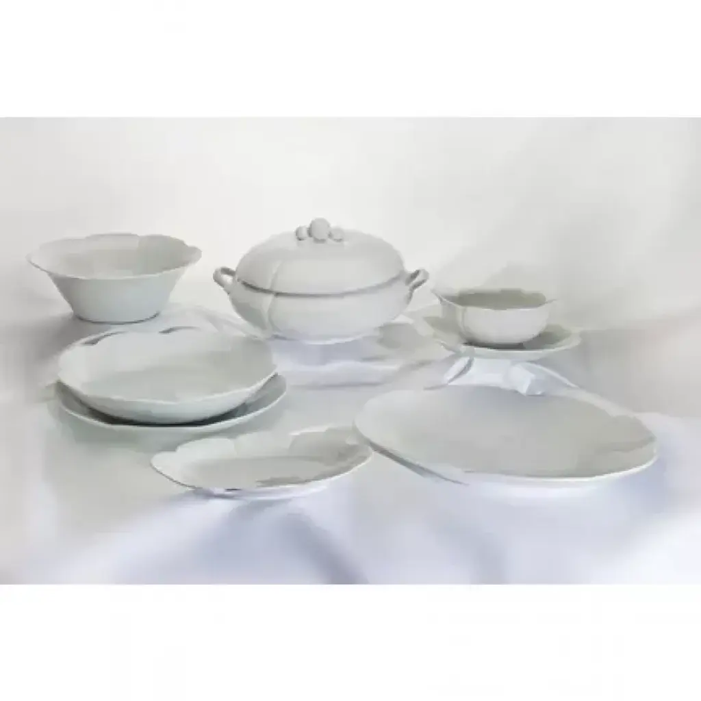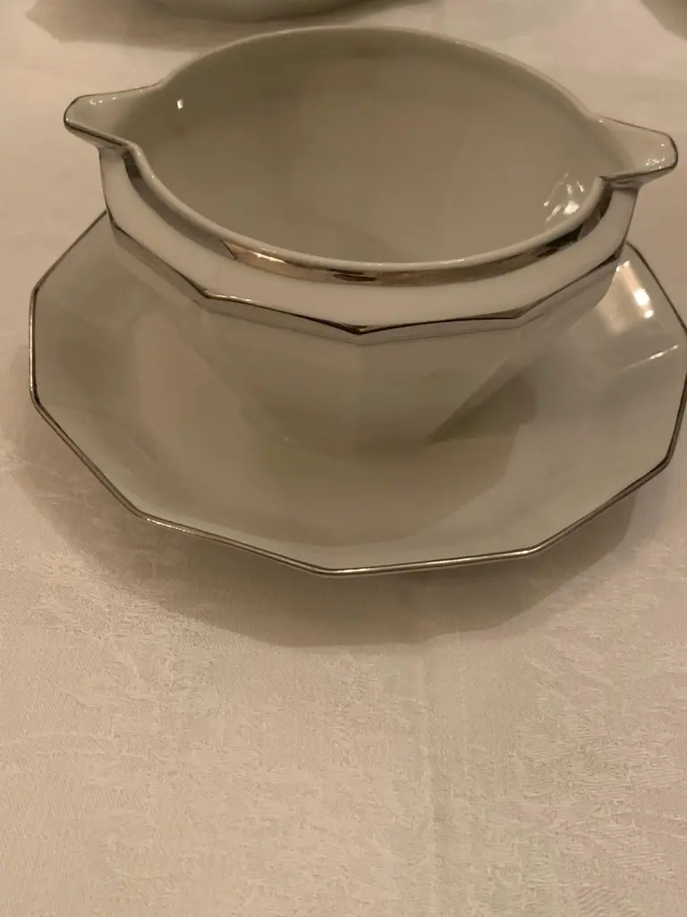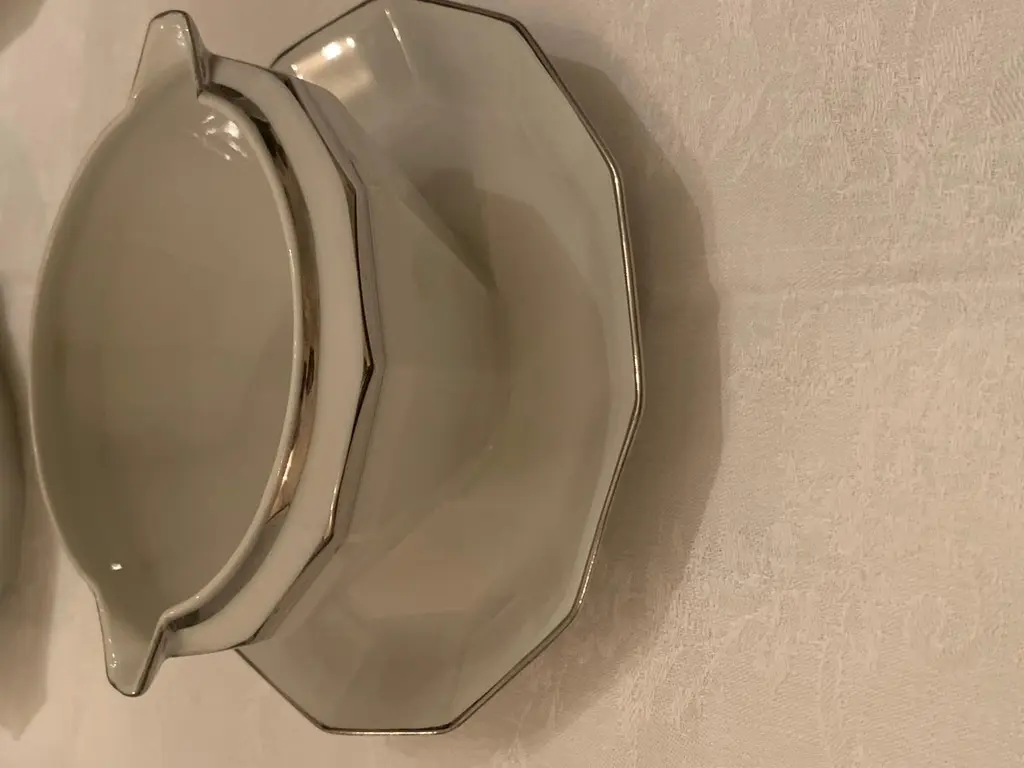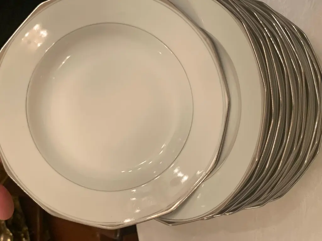 Very beatifull Limoges porcelain dinner set in the modern style comprising 73pieces,it is a dinner set for 12 peoples ,all the plates , dishes,and shapes pieces are all decorated with a silver-colored border 12 soup plates ,12 dessert plates, 36 large plates,1 soup tureen,1 vegetables bowl,1 saladbowl,2 serving dishes,2 display stand, 1 sauce boat,2 serving dishes, 1 display dish, 2 display dishes