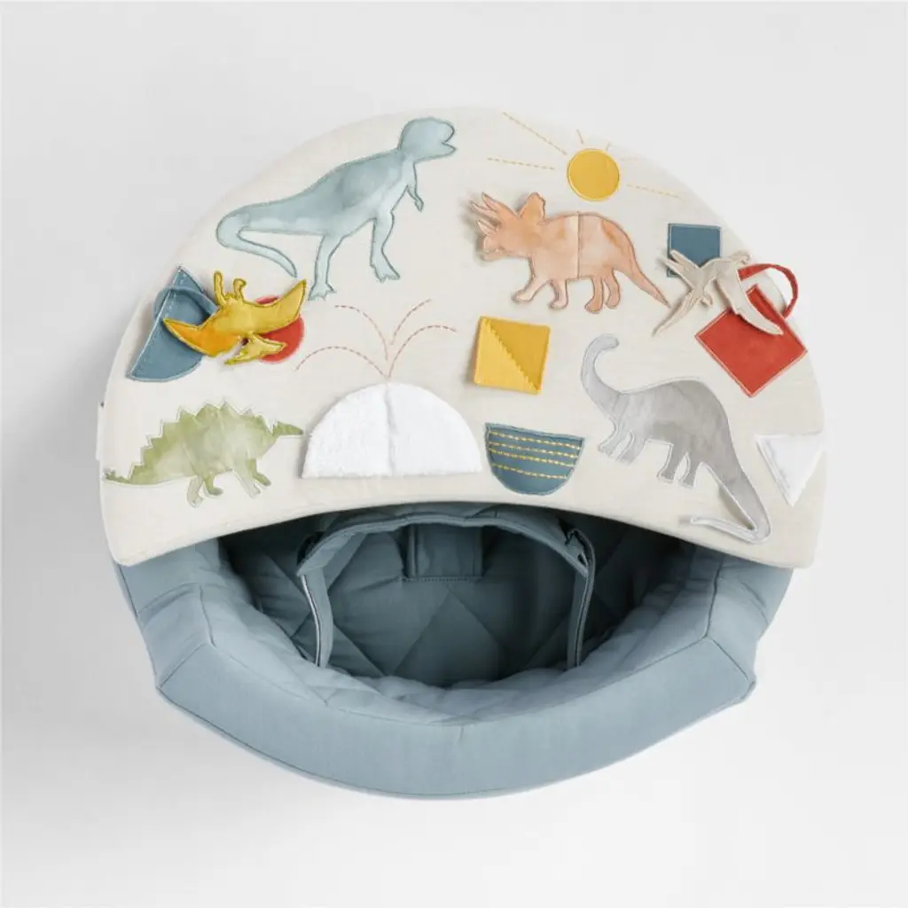 Decked out in prehistoric scenes, our exclusive Dino Buddies activity chair lets your future paleontologist enjoy the best seat in the house. Its removable activity tray features dinos, moveable flaps and a chance to squeak and crinkleessential "research" play that helps little ones develop motor skills through sensory input. The cotton-wrapped chair, cushioned for comfort and equipped with a safety harness, features a quilted pattern in a gender-neutral color perfect for the modern nursery.