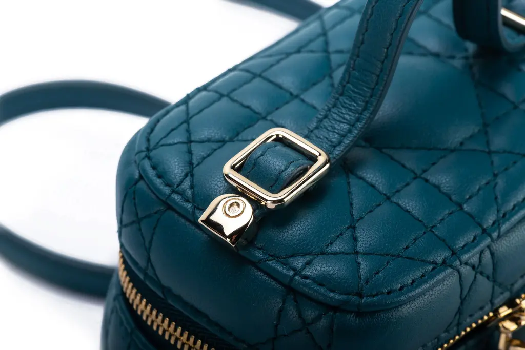 Dior mini travel case in turquoise can age quilted leather and gold tone hardware. Handle drop 1.5, shoulder drop 21. Comes with ID card and original dust cover.