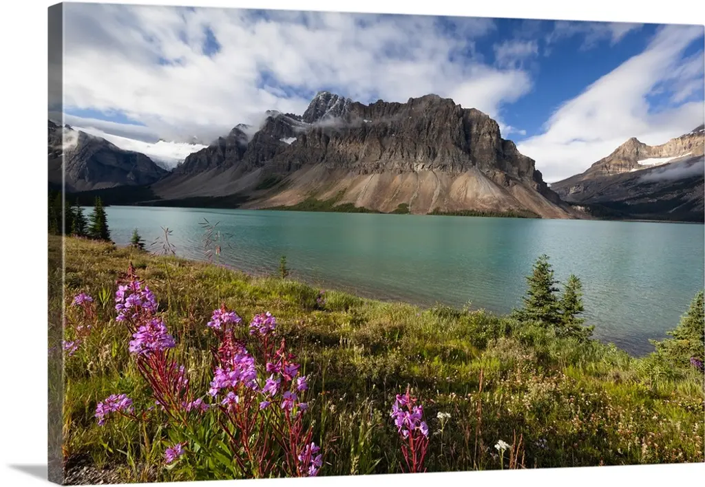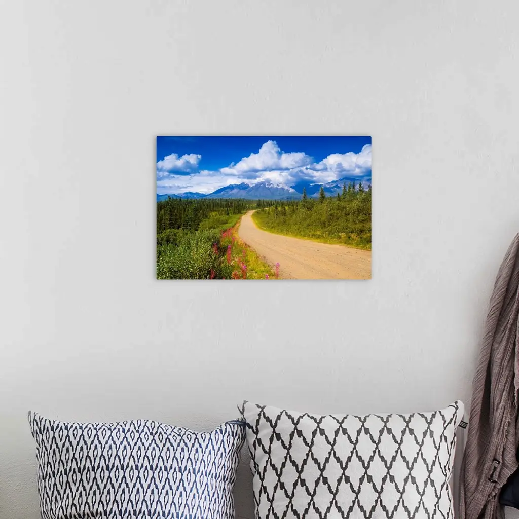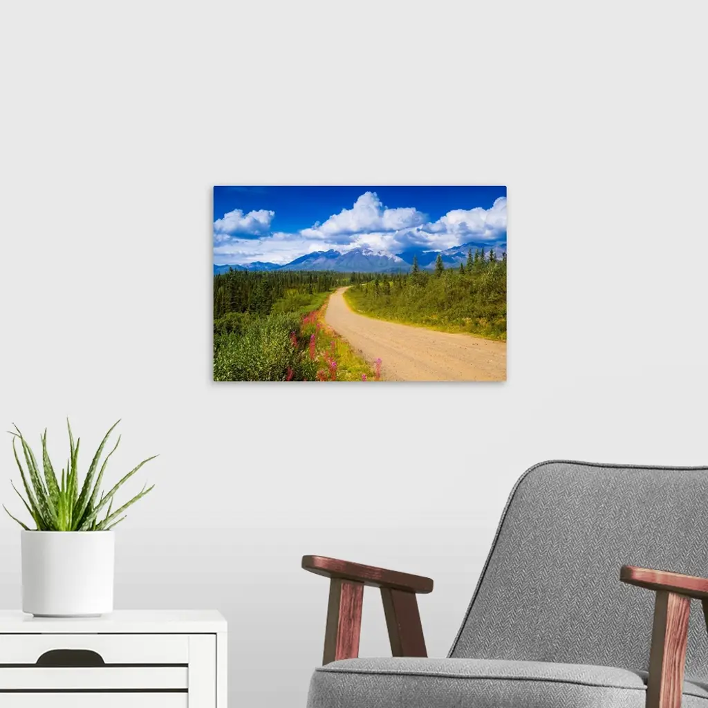 Landscape photograph on a big canvas of a dirt road curving through a forest of pines and wildflowers, mountains on the horizon beneath a blue sky with large, fluffy clouds, in Alaska.