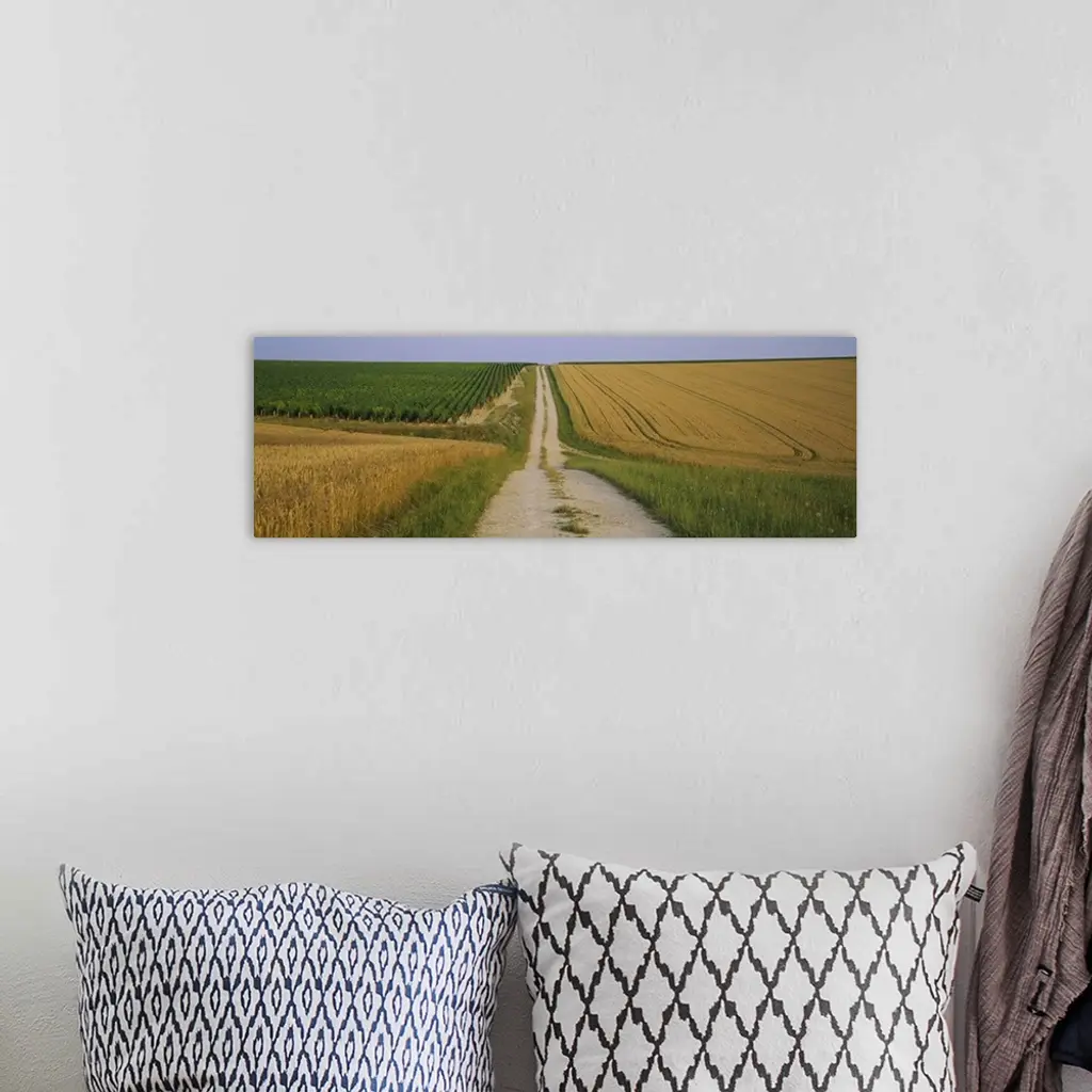 Dirt road passing through a wheat field, Chablis, France wall art for home and office decor. Discover canvas art prints, photos, mural, big canvas art and framed wall art in GreatBigCanvas.com's varied collections.