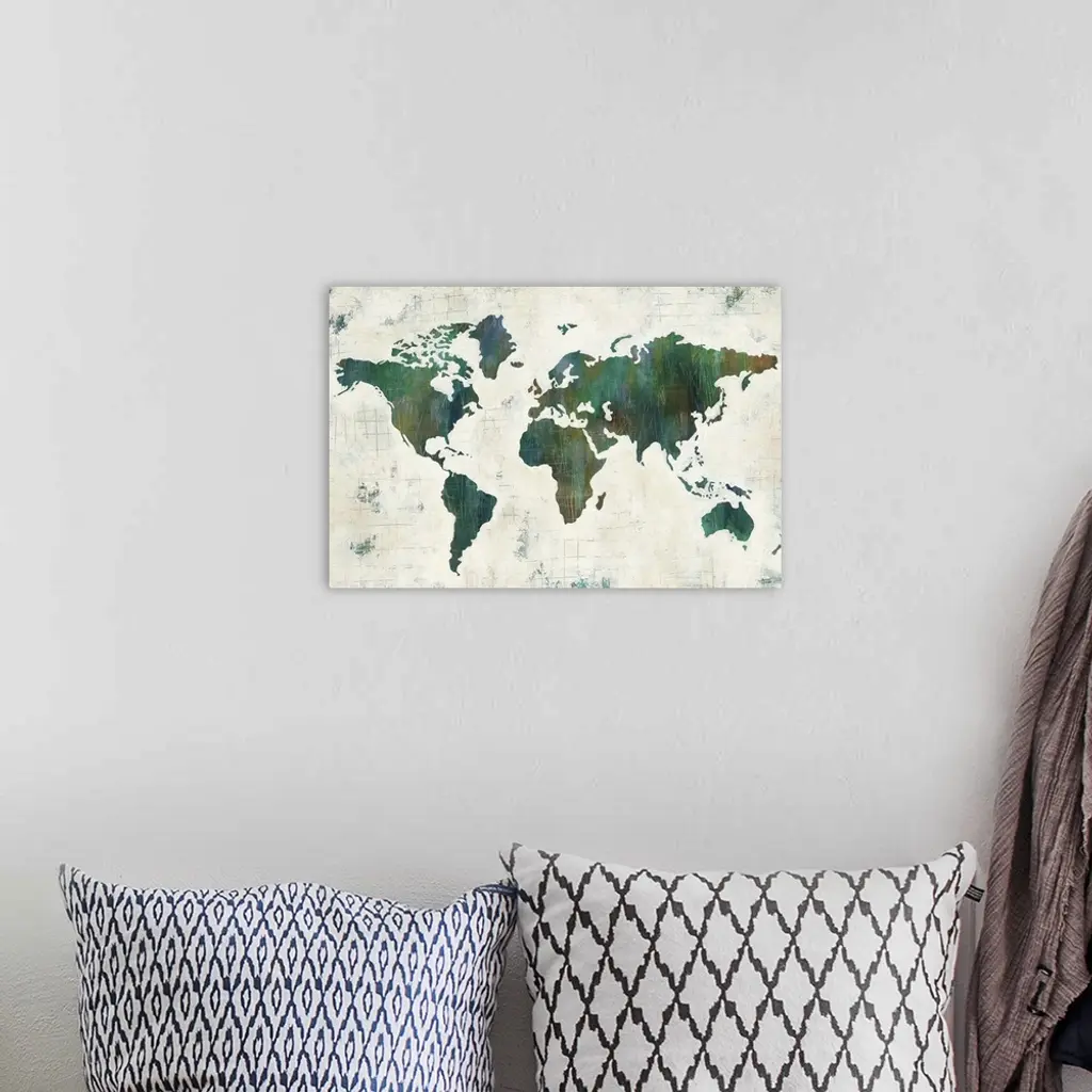 Contemporary artwork of a world map in a dark green against a neutral toned background.