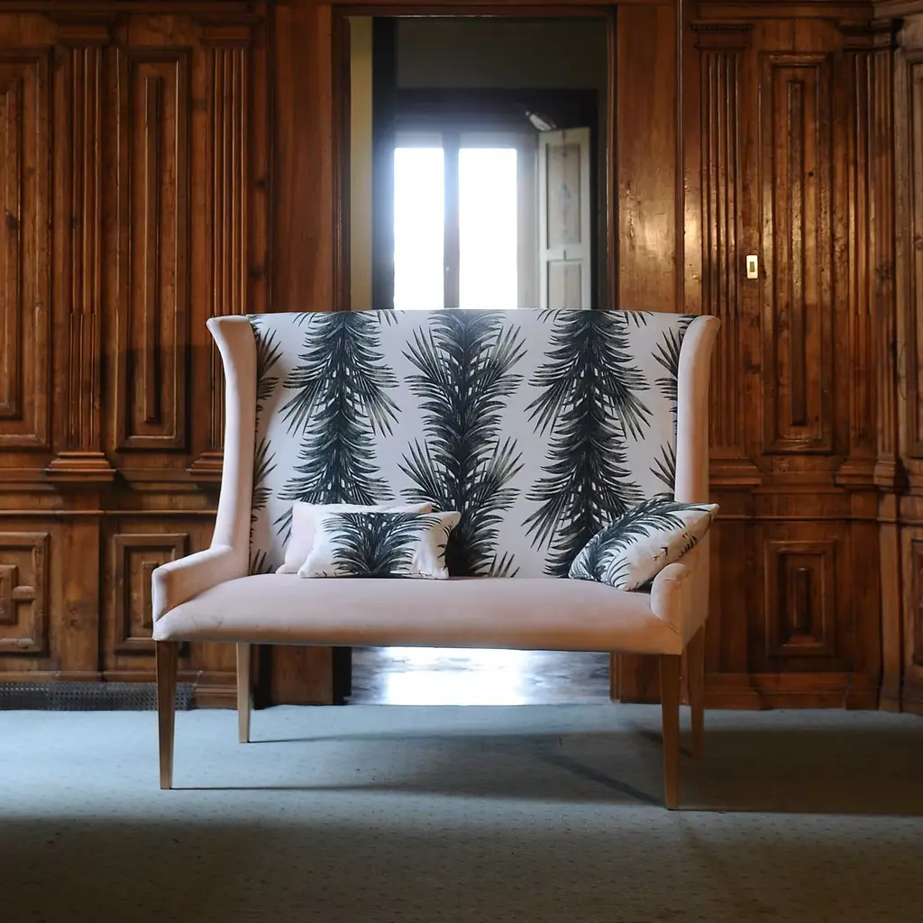 With a classic and charming design, the Diva Divan will bring an element of joy to any sitting area. This two-seater wooden sofa features a real gold leaf finish on the legs applied by hand and an antique pink velvet fabric for the seat and armrests. The unique backrest is upholstered in a floral Christian Lacroix fabric.