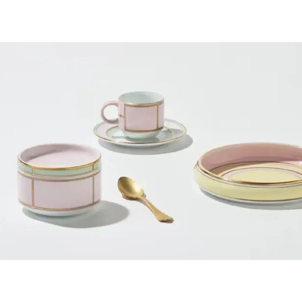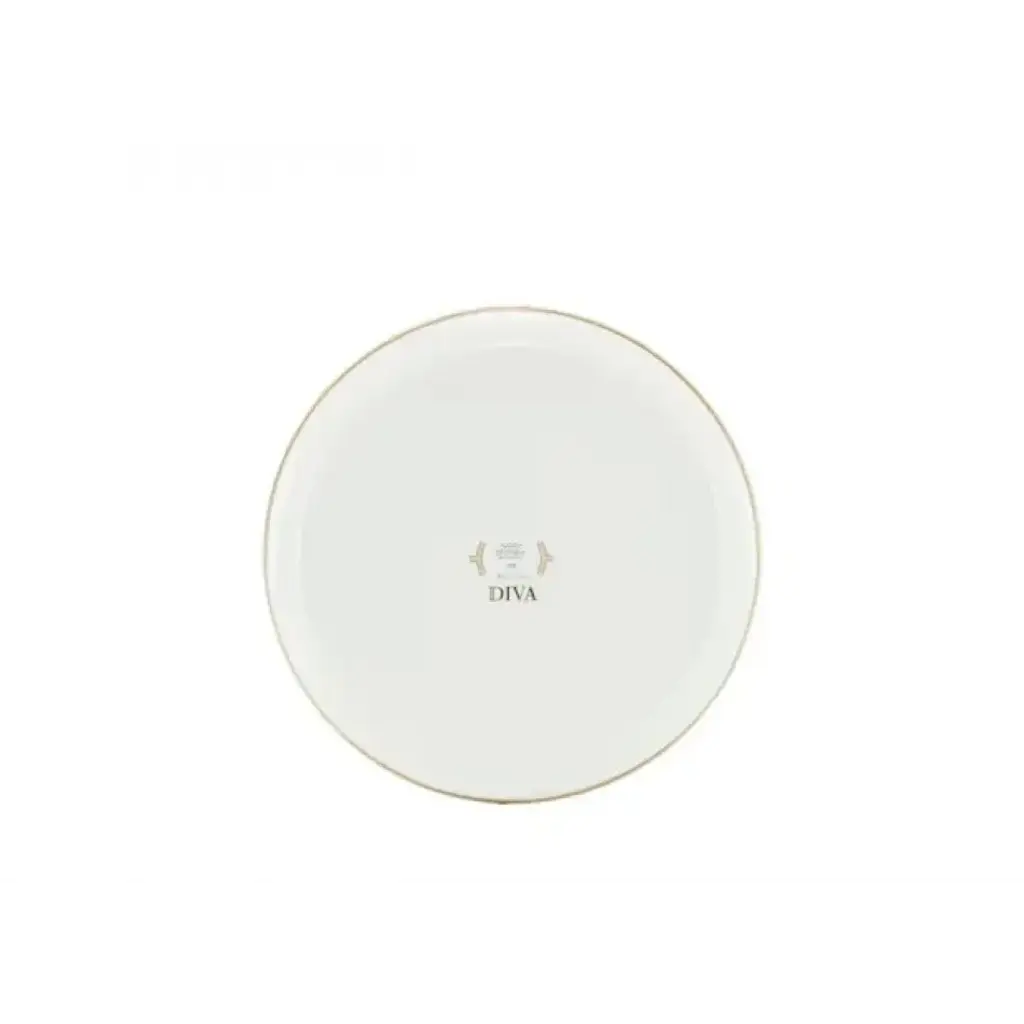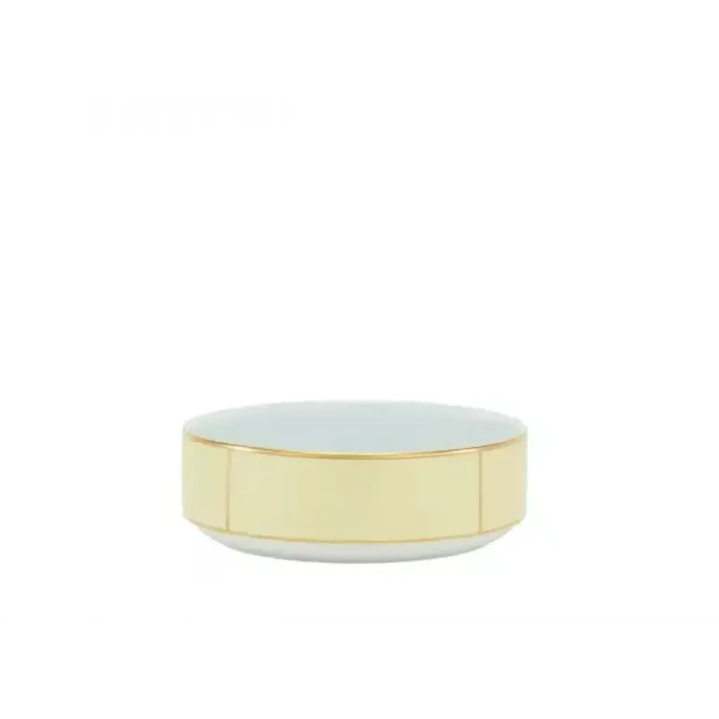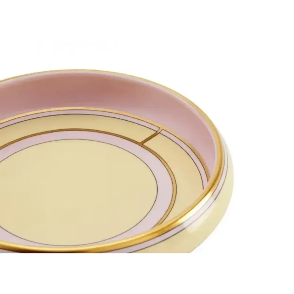 Round porcelain change tray with Giallo and gold decoration. New Diva collection. It is distinguished by a yellow decorative motif embellished with luminous gold threading. Available in four pastel shades, it serves to contain valuable items as it adds a touch of refinement to the décor of any room. In unique mise en place, it can be used to serve dainty courses, from hors d'oeuvres to desserts. It comes wrapped in an exclusive luxury box, making it a perfect gift. Diva enriches the Florentine Maison's porcelain offering with an elegant and colorful aesthetic inspired by the great divas of mid-20th-century cinema. In addition to the giftware line, it comes in table, tea and coffee sets that feature the stackable shapes of Colonna, a 1950s icon of design by Giovanni Gariboldi, that can be stored easily in small spaces.