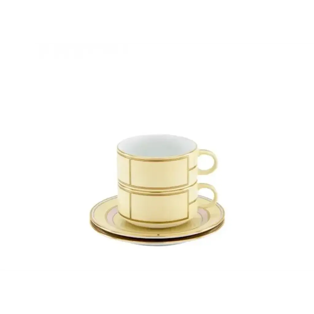 Porcelain tea set for two with Giallo and gold decoration. New Diva collection. The complete set consists of two cups and two saucers in porcelain with a decorative motif in yellow and gold threading. The Colonna shape characterizes the design, which is meant to be stacked into symmetrical compositions and stored in small spaces. It comes packaged in an exclusive luxury box, making it the perfect gift. Diva is a collection of tableware and giftware available in four coordinating pastel shades to that can be combined to suit your personal taste. It captures the allure of a bygone era in a contemporary and modern concept that celebrates the vibrancy of the 1950s and the timelessness of Italian coffee culture.