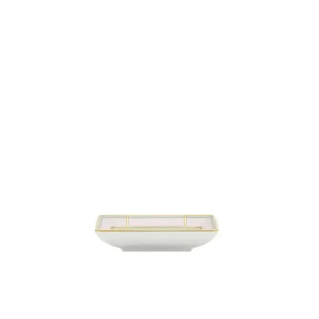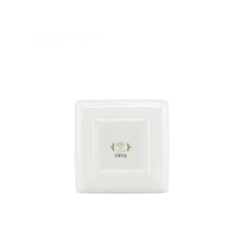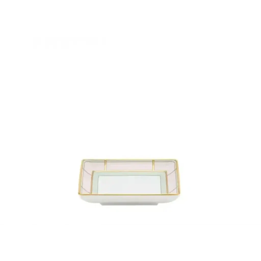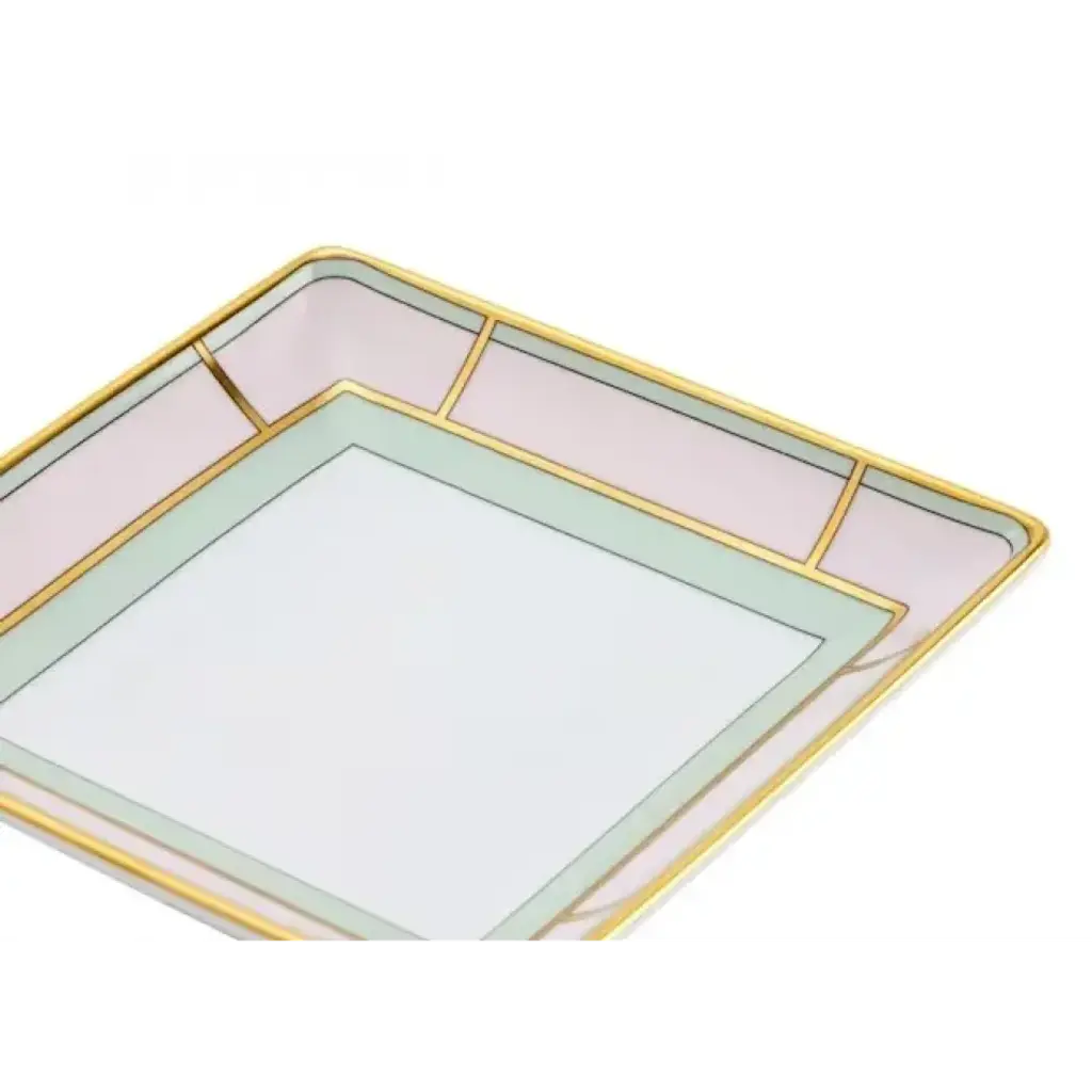 Square porcelain change tray with Rosa and gold decoration. New Diva collection. It is graced with a pink and green decoration and embellished with exquisite gold threading. Available in three other colors, it is presented in a luxury box, making it perfect, as well as the perfect piece for containing small items of value in the unmistakable style of Ginori 1735. Diva is a porcelain collection available in a tableware & giftware assortment. It is characterized by a contemporary design that captures the vibrant energy of mid-20th century Italy and the glamour of the great divas who shaped the history of 1950s cinema.