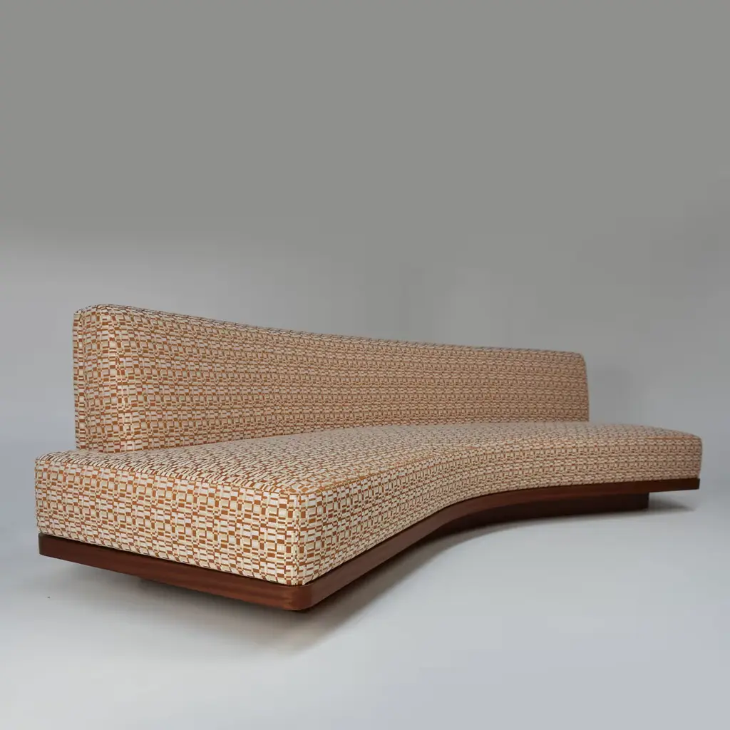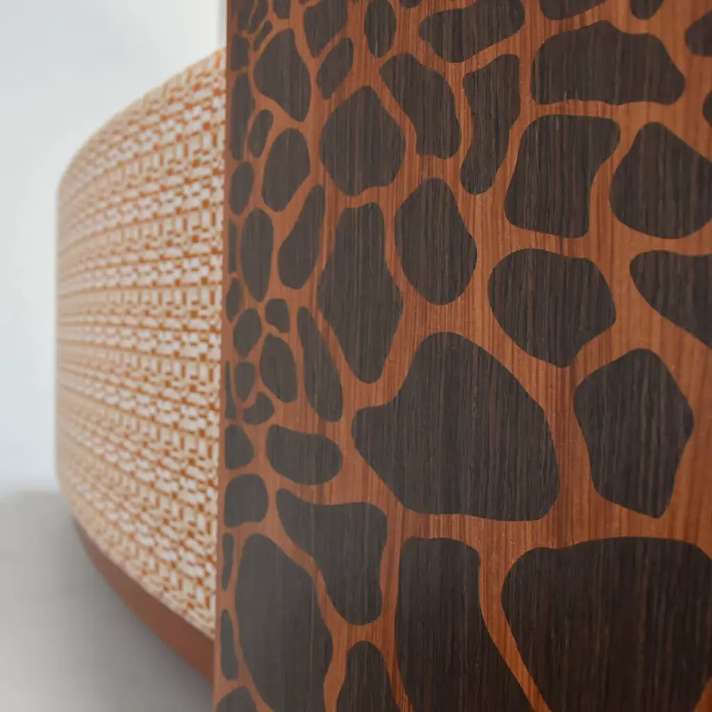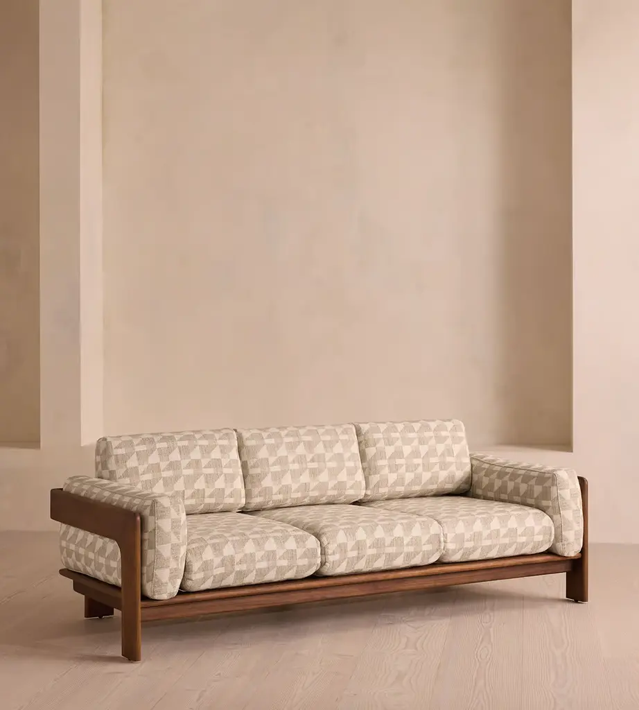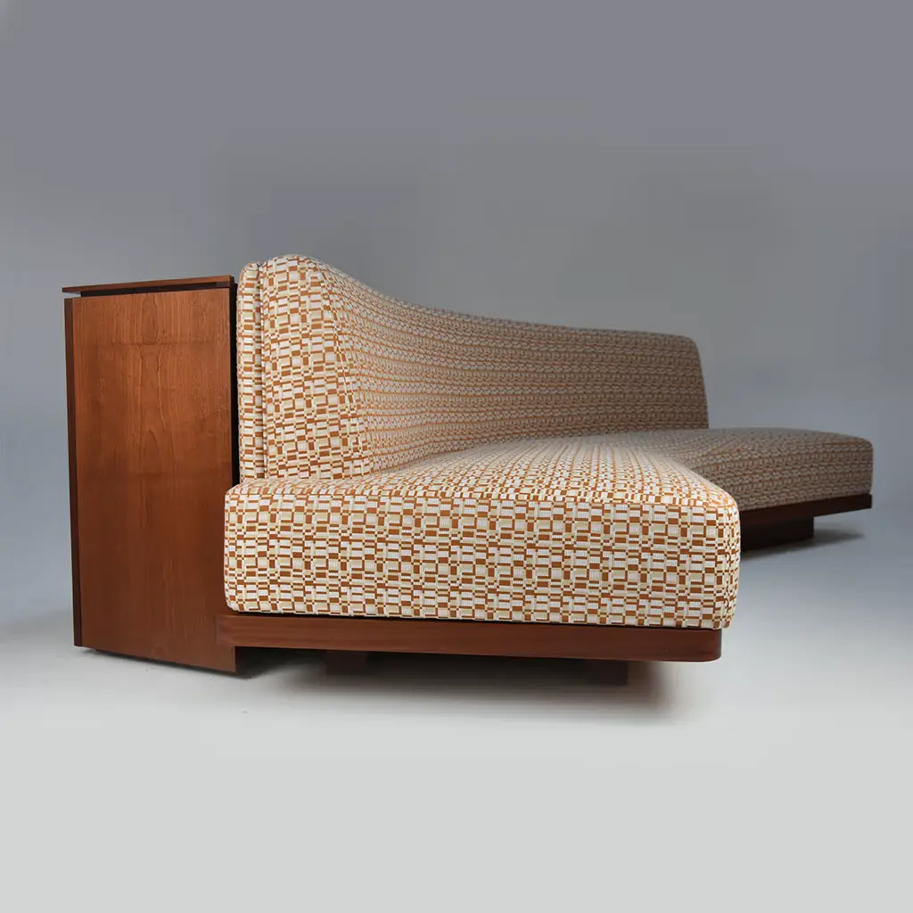 Sofa with a back cabinet made of mahogany plywood featuring a giraffe-striped inlay, with two doors and a shelf. It comes with scatter cushions upon request and is upholstered in a fabric with a subtle check jacquard pattern blending three harmonious colors. This piece is ideal for complementing any decor with its geometric motif.