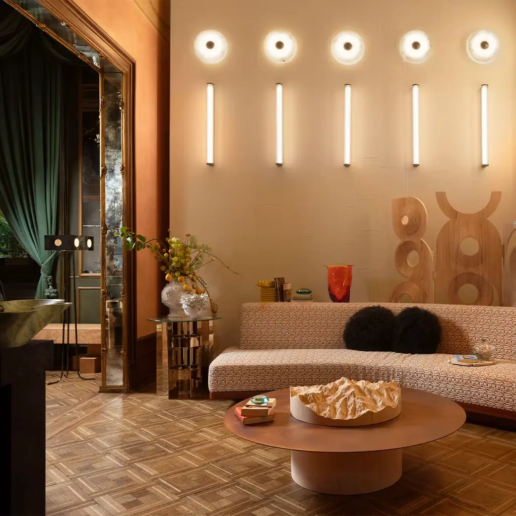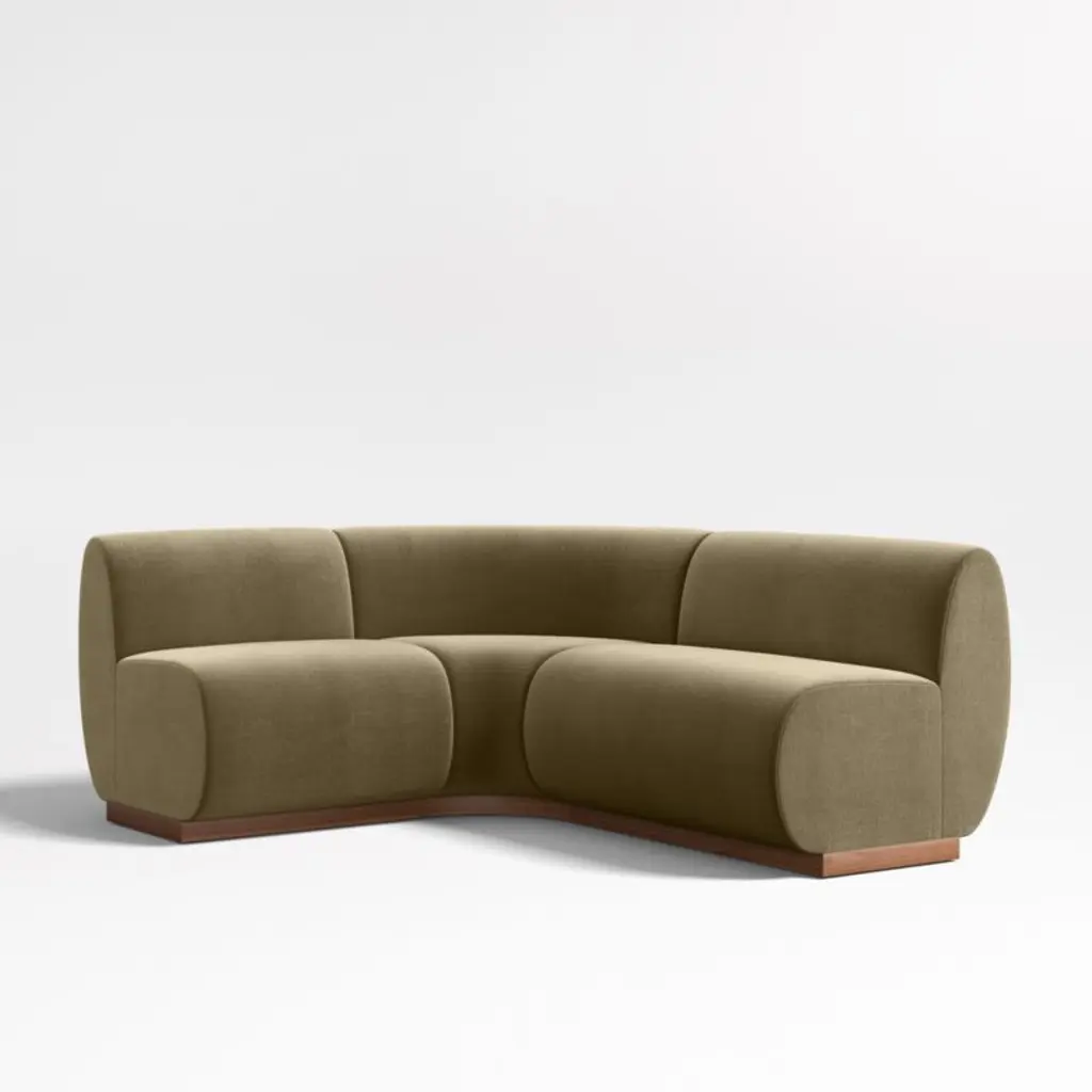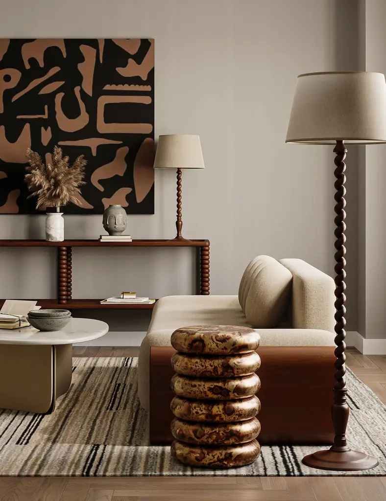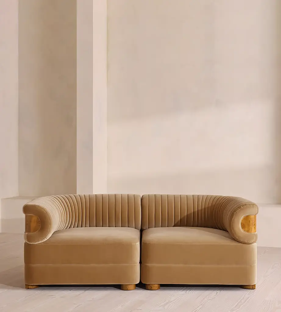 Sofa with a back cabinet made of mahogany plywood featuring a giraffe-striped inlay, with two doors and a shelf. It comes with scatter cushions upon request and is upholstered in a fabric with a subtle check jacquard pattern blending three harmonious colors. This piece is ideal for complementing any decor with its geometric motif.