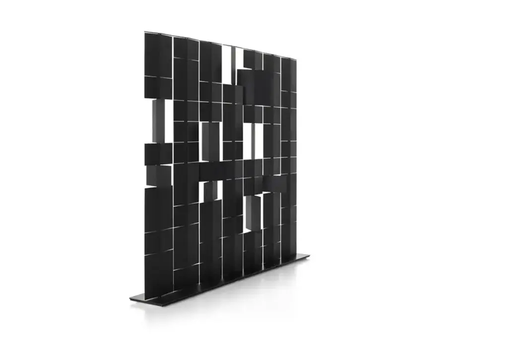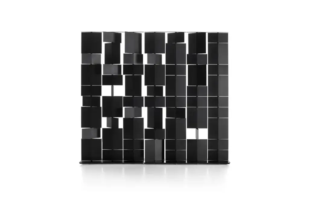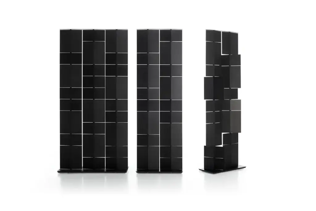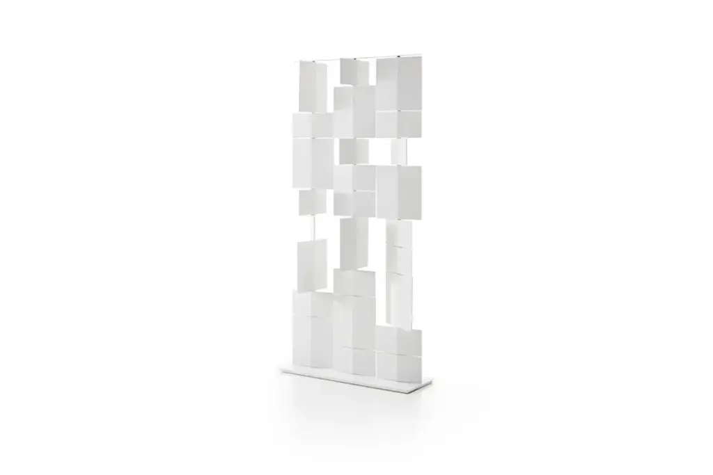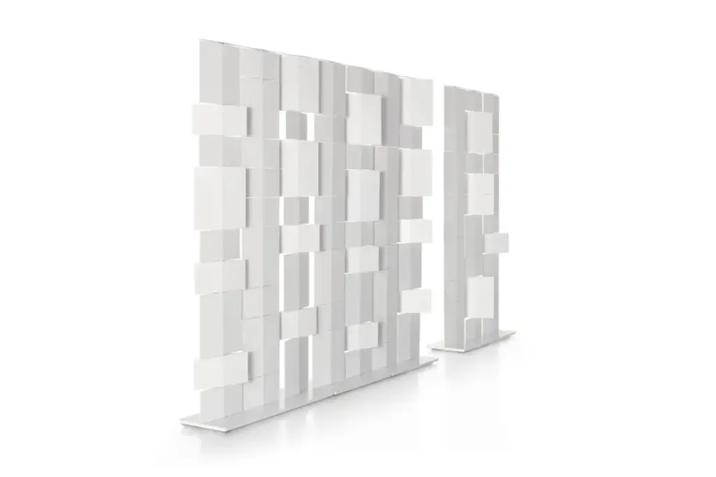 Divide IT was created to meet these needs: it is a dynamic product that adapts to every requirement and allows you to divide the work spaces and the home environment, to define unconstrained scenarios between work area and living, between semi-private and public areas; nowadays a precise, formal and traditional definition of the space is no longer relevant.The user can determine and control the passage of light and sound with his own hands, rotating each panel on an axis at 360 degrees. This rotation allows for neverending possibilities of partition, transition and diffusion.Divide IT invites the user to interact with it, as if it was a “toy” able to give fun and even a smile.StructureLoad-bearing structure in aluminium sheet, bonded with metal anti-tilt weight, spherical steel castors (upon request) for easy 360° movement, uprights in steel, Ø 20 mm, with brake, and upper crosspiece in aluminium.The entire structure is finished in matt white or black epoxy powder coating.The swivel panels can be rotated by 360°.Made in integral polyurethane painted in the mould, they come in two sizes, in the colours matt white and black, and are arranged in an alternated, defined geometric sequence. Dimensions and typesEach divider element is available in two different sizes, W90 and W60, (see sample compositions), which can be arranged or placed to form attractive large-sized configurations.Divide IT is always monochromatic and available in the following combinations:• matt white structure with matt white swivel panels;• matt black structure with matt black swivel panels.AccessoriesThe kit of castors is available only for hard floors (marbles, granite, terracotta, ceramics, gres, stone, concrete, et cetera).MaintenanceFor correct cleaning avoid alcohol-based products, use water and mild neutral soap. Rinse thoroughly after washing, only with water.