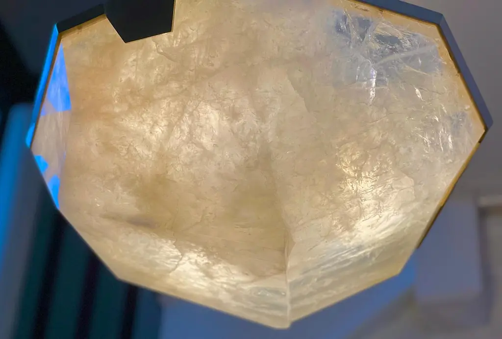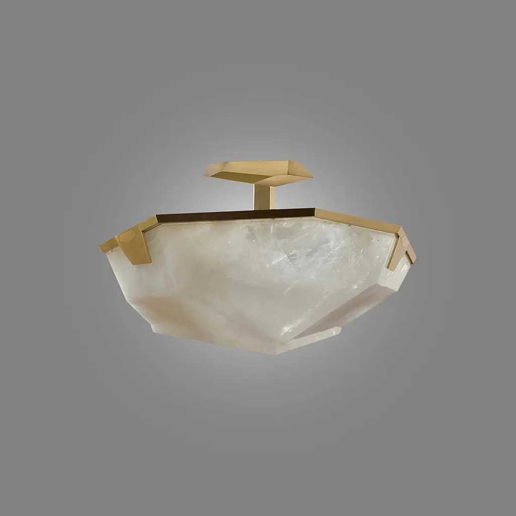 Fine carved diamond form rock crystal semi flushmount with satin brass finish.Created by Phoenix Gallery NYC.Custom size upon request.