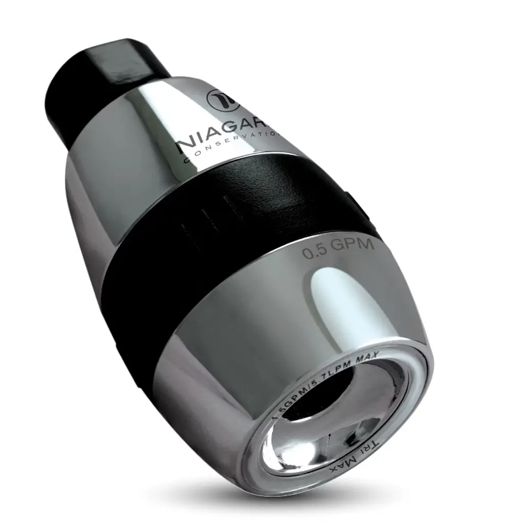 Solid brass faucet aerator with On/Off switch allows you to set the desired water temperature and easily turns the water On or Off while rinsing dishes, shaving, washing hands, etc. When shut off, aerator will still allow for a small trickle to relieve water pressure. Dual thread fits standard kitchen and bath faucets. 1.5 GPM. Chrome finish.