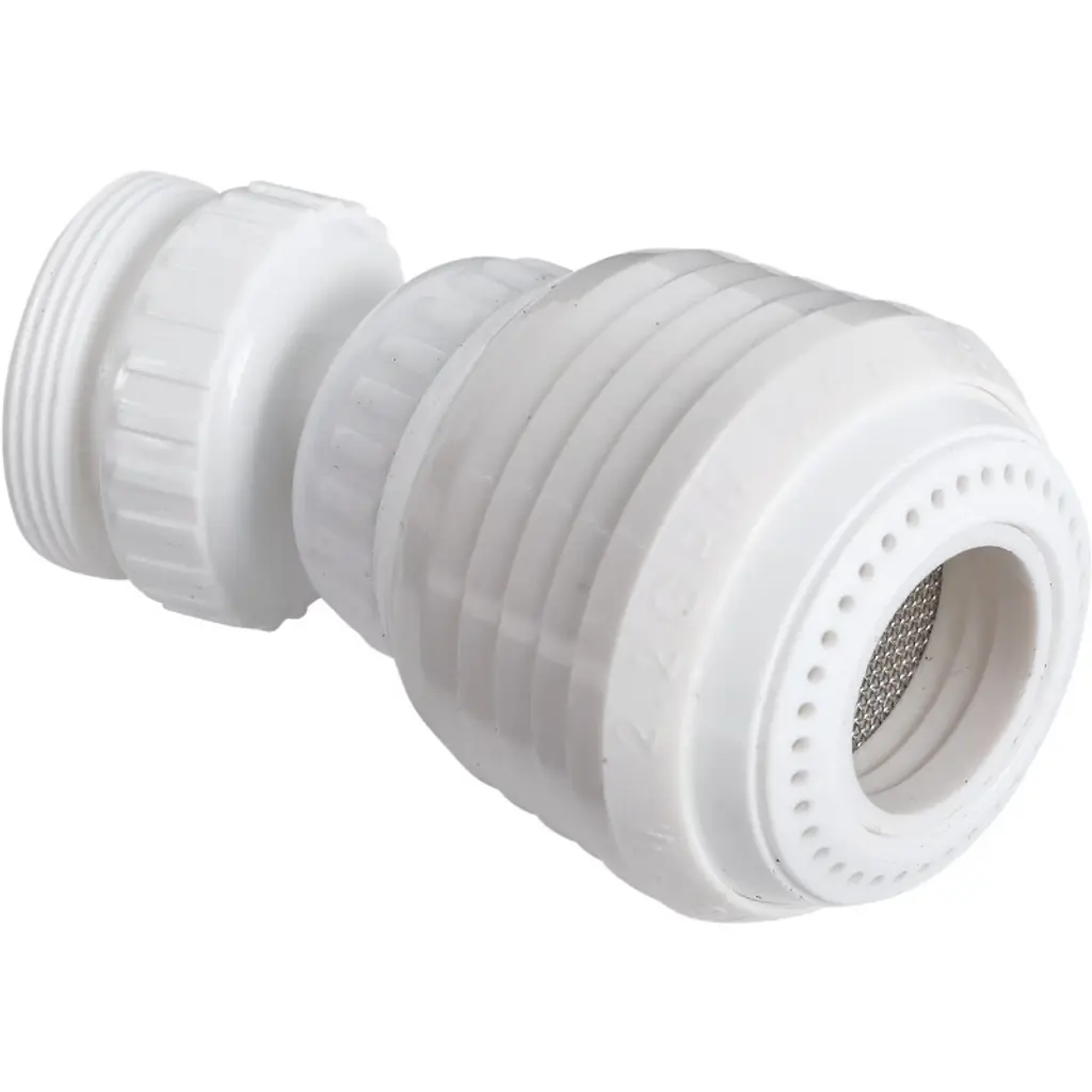 Fits faucets with 55/64" x 27 outside threads or 15/16" x 27 inside threads. Aerates, sprays, and swivels. 2.2 GPM, 2.5 GPM maximum (gallons per minute). Plastic. Carded.