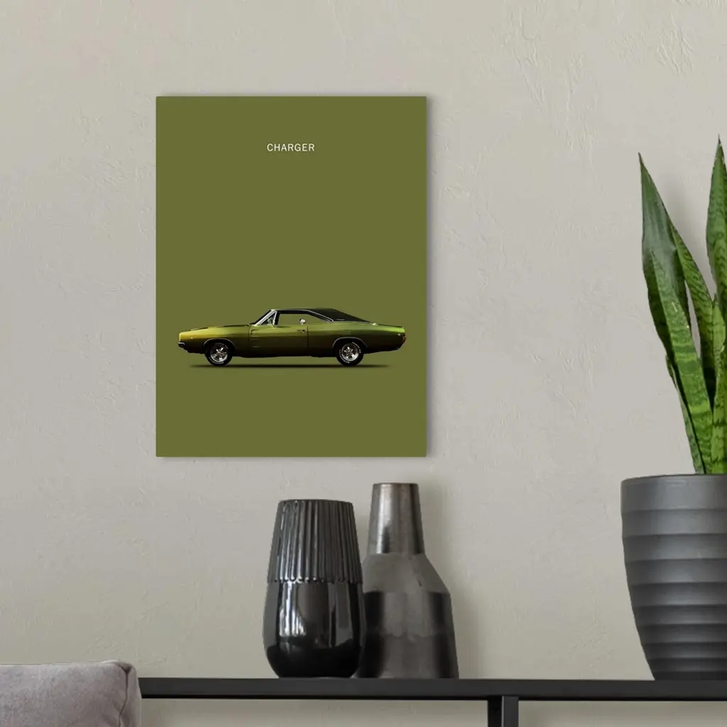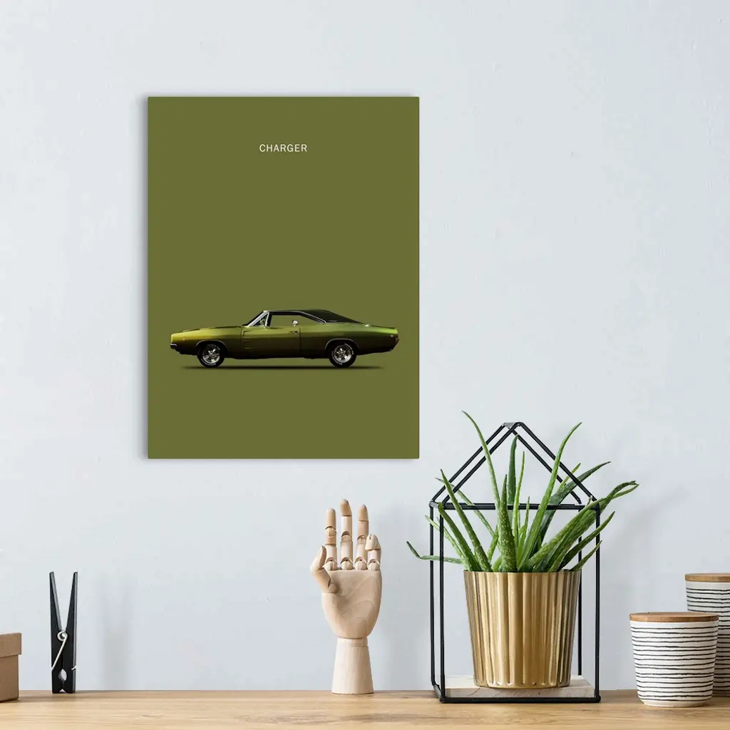 Photograph of an olive green Dodge Charger printed on a dark green background