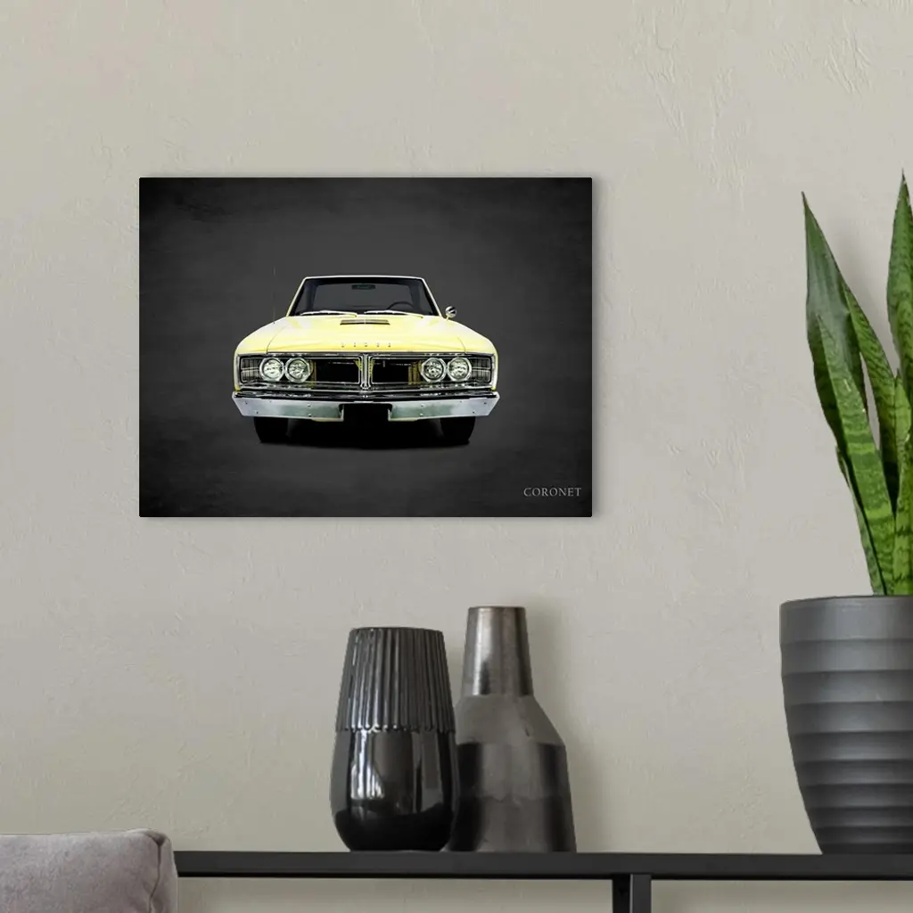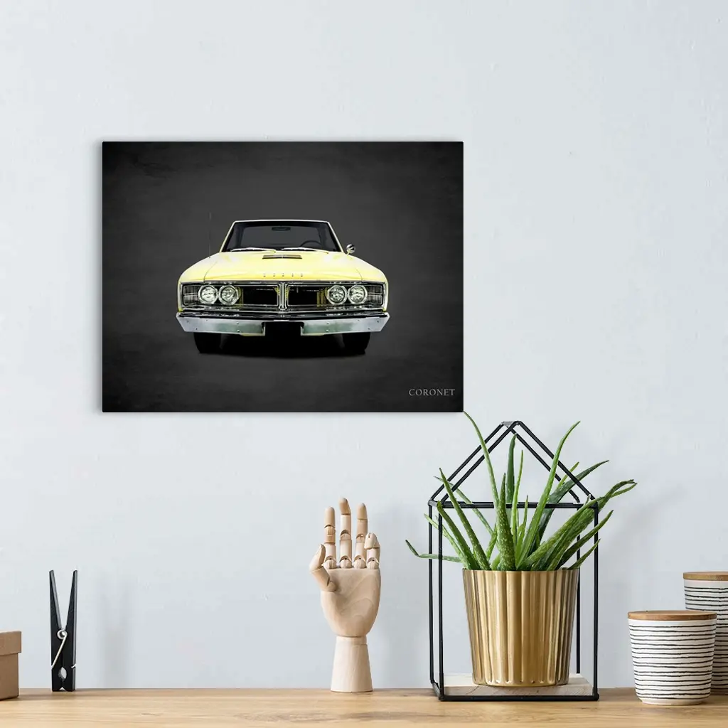 Photograph of a yellow 1966 Dodge Coronet printed on a black background with a dark vignette.