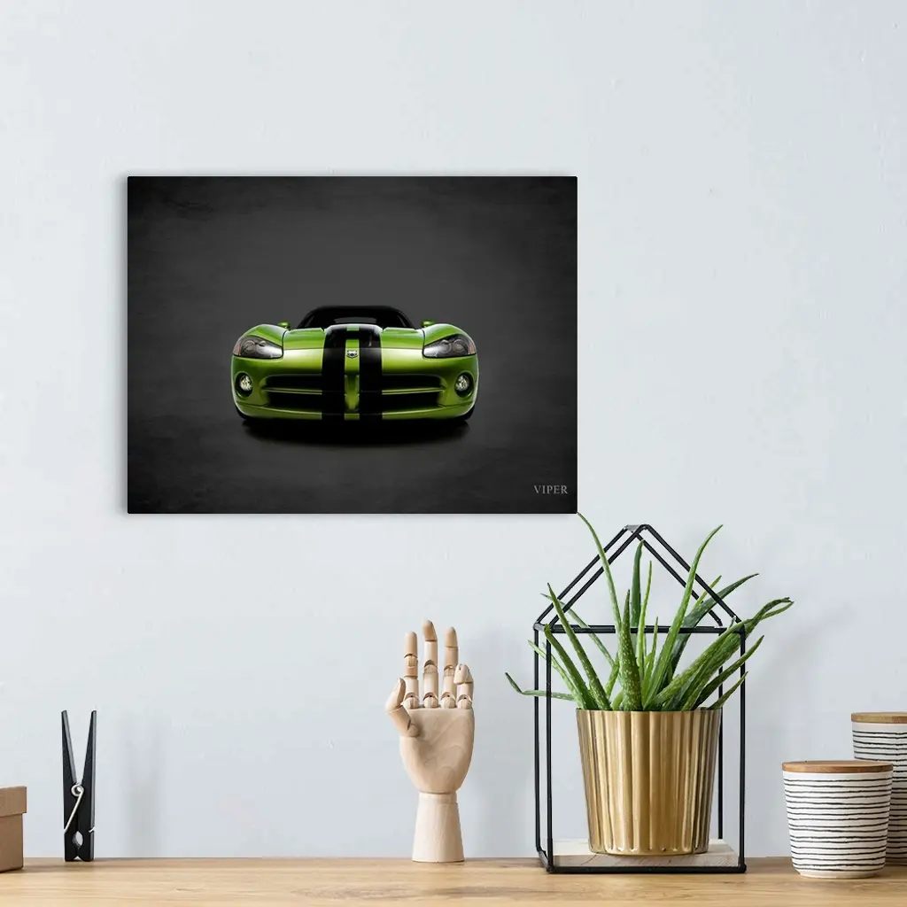 Photograph of a green Dodge Viper with black stripes printed on a black background with a dark vignette.