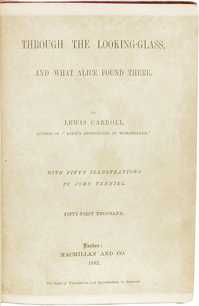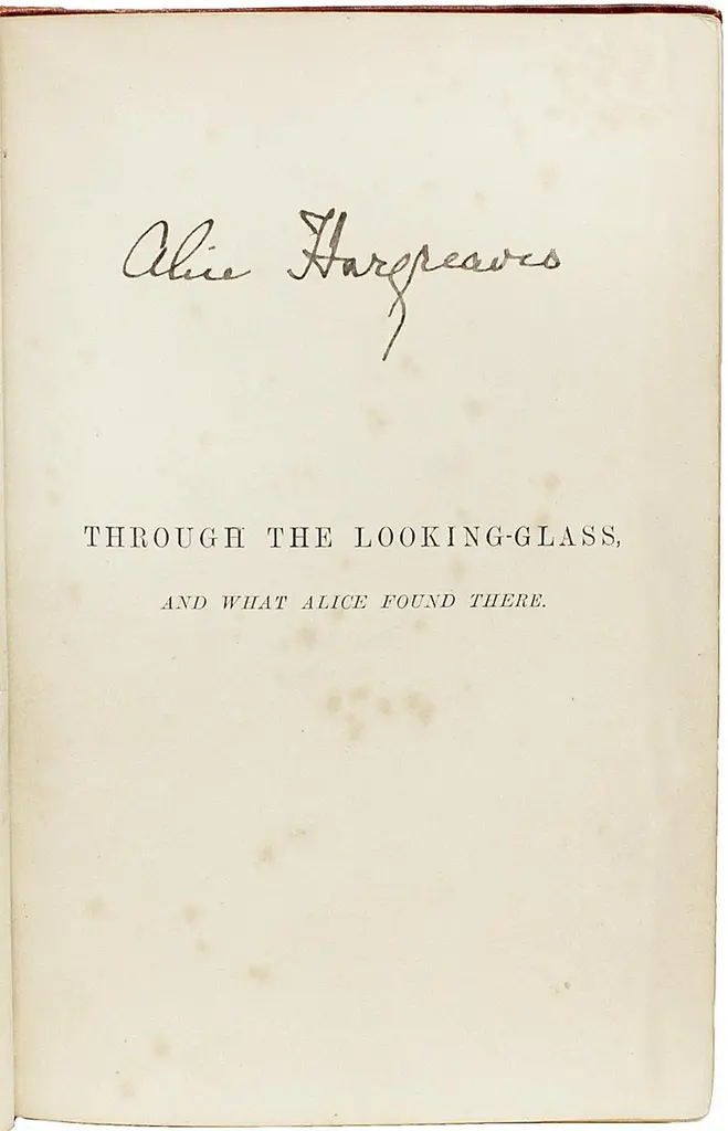 AUTHOR: DODGSON, Charles Lutwidge: ( Lewis Carroll ). TITLE: Through The Looking-Glass, And What Alice Found There.PUBLISHER: London: Macmillan and Co., 1882.DESCRIPTION: SIGNED BY ALICE. 1 vol., 7-3/8" x 5-3/8", signed by the original Alice on the half-title "Alice Hargreaves", illustrations by John Tenniel. Bound in the publisher's original gilt stamped red cloth, "Burn" binder ticket to rear pastedown, all edges gilt.CONDITION: Neat contemporary ownership signature to front endleaf dated Jan. 1883, some offsetting to the frontis and title-page from the tissue guard, otherwise internally clean and bright, spine neatly relined, general handling, overall a VERY GOOD copy.