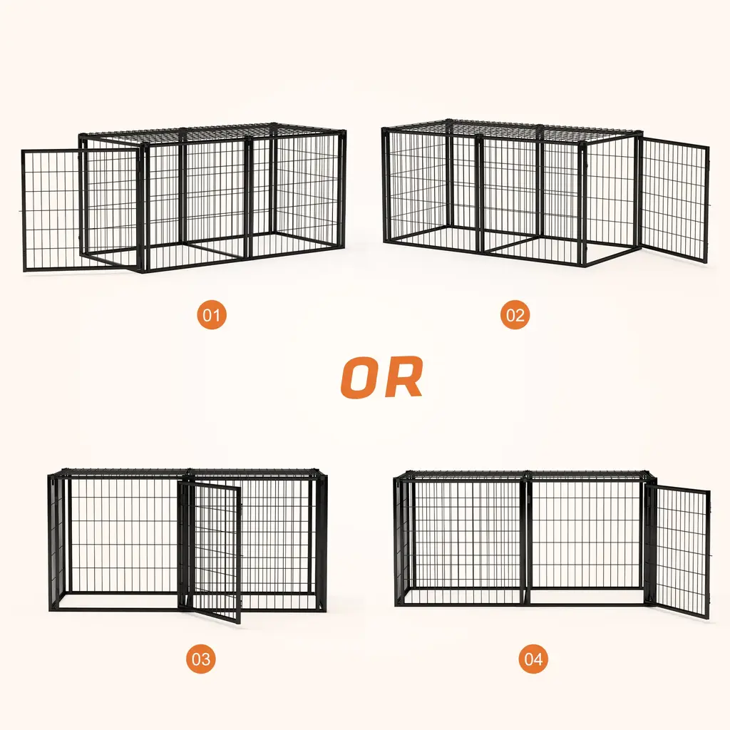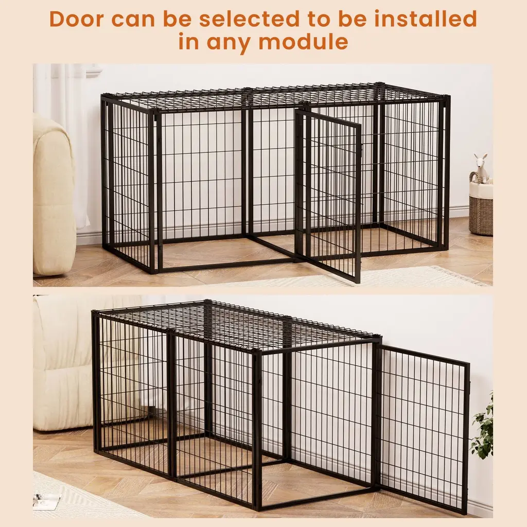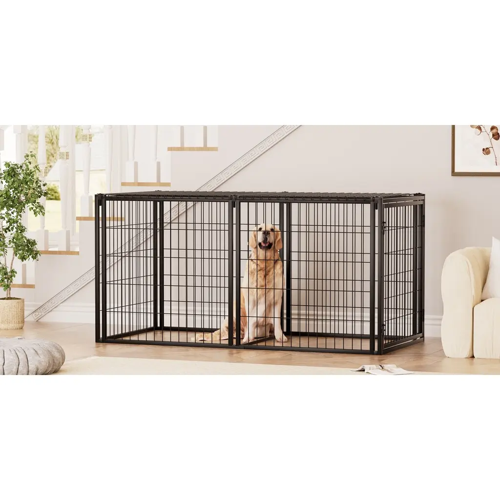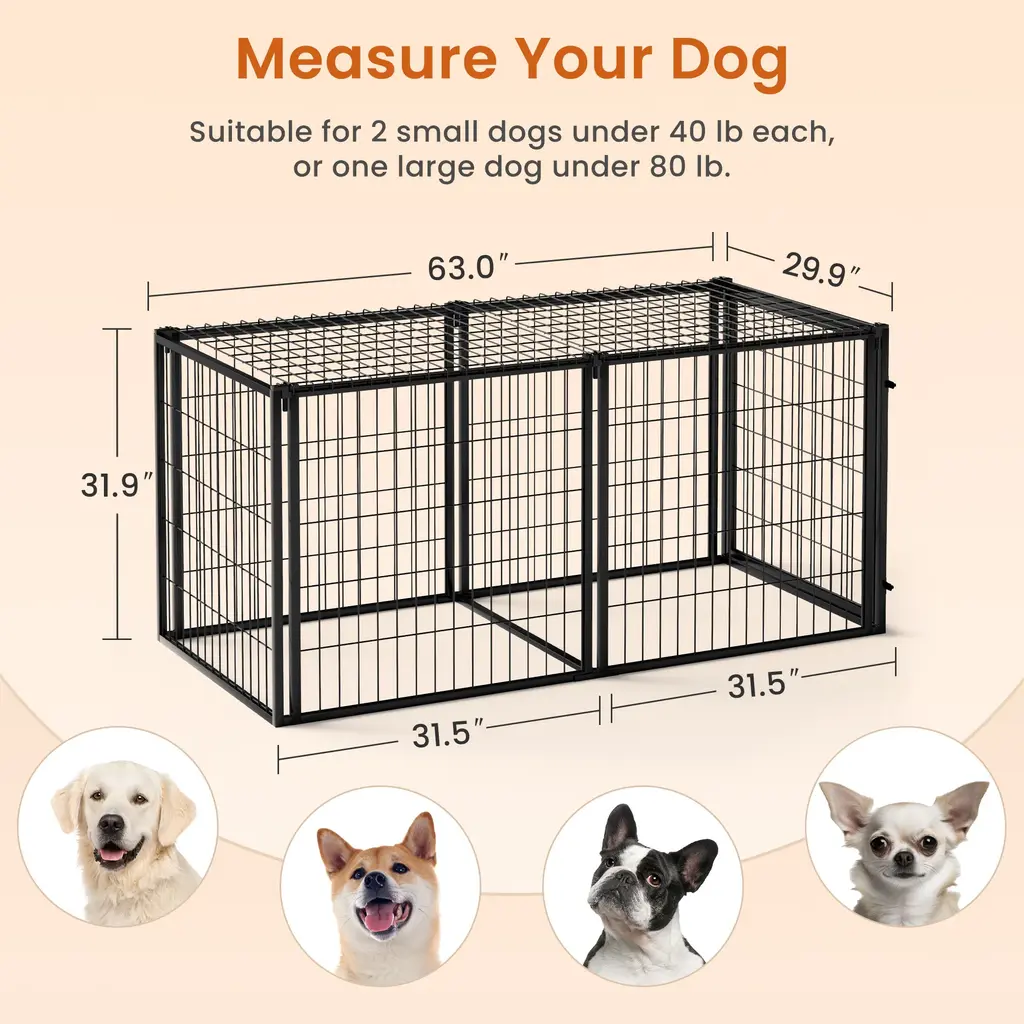 Warm tips: Product after-sales guide 🚀Thank you for purchasing our products!Please do not return the product in case of problems. Please take a photo and send it to us, we will quickly process and provide a reasonable solution. Thank you for your cooperation! 🙏Durable materials:The dog cage is made of high tensile strength metal wire and is suitable for small and medium-sized dogs. The frame of the cage is coated with a professional coating, which is rust proof, corrosion-resistant, and fade resistant.Safe top cover and flexible door placement: The dog cage has a safe top cover that can effectively prevent your pet from escaping. You can open it and play with the dog, or you can lock it directly. In addition, it provides the flexibility to install doors at any desired location, allowing you to customize access points based on the layout of your home or the specific needs of your pets.Divider: You can act as a divider by removing a top cover and inserting it into the middle of this dog cage and locking it, so that two dogs have independent space.Right Size: The size of the dog crate is 63"L x 29.9"W x 31.9"H, before purchasing, please measure the height and length of your pet to ensure enough comfort. This dog crate furniture has a spacious interior for your furry friend, suitable for 2 small dogs under 50 lb each, or a large dog under 100 lb.Assembly is a piece of cake:You only need to assemble the independent fence through connectors, and one person can complete the assembly in 20 minutes. Set up a comfortable living space for your pet.Product InformationProduct typedog crateColorBlackMaterialIronExterior Measurements63.0"L x 29.9"W x 31.9"HBest suited for medium sized dogs50-90 lbsAssembly RequiredAbout 20 minPackage number1