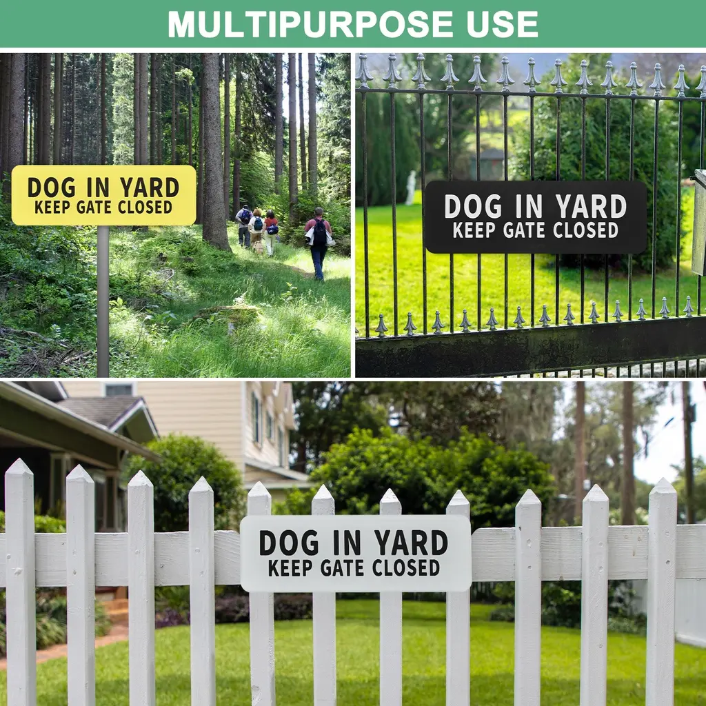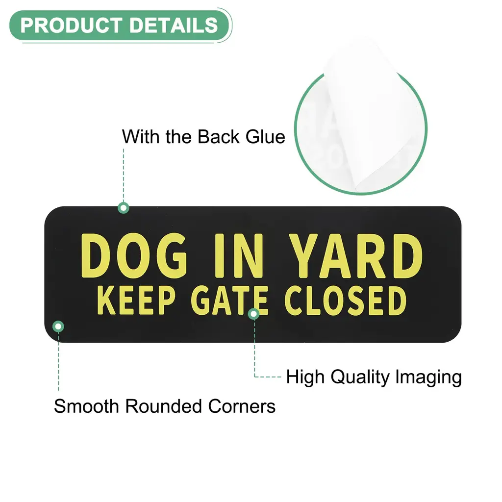 PRODUCT APPLICATIONSThis door sign is universal for various applications. They can be used indoors or outdoors, home, yard, door, etc.PRODUCT DETAILS & INCLUDE√ Material: Acrylic with adhesive backing√ Color: White Letters On Black Background√ Diameter: 9x3 Inch(L*W); Height: 4.5mm/0.18 Inch √ Package Includes: 1-Pack x Dog in Yard Keep Gate Closed for HomePRODUCT ADVANTAGES1. Dog signs are made of acrylic, which is durable, anti-rust, and waterproof, it has good wear resistance and can be used for a long time.2. This yard sign has the back glue, and rounded corners designed for easier installation, that is, tear and stick. Alerts some people, couriers, and visitors to the presence of a dog in the yard, ensuring safety for both pets and people.ATTENTIONBecause of the light, the color and size will be slightly wrong.