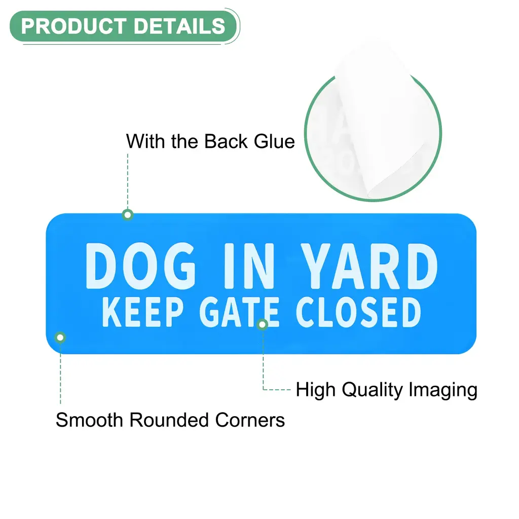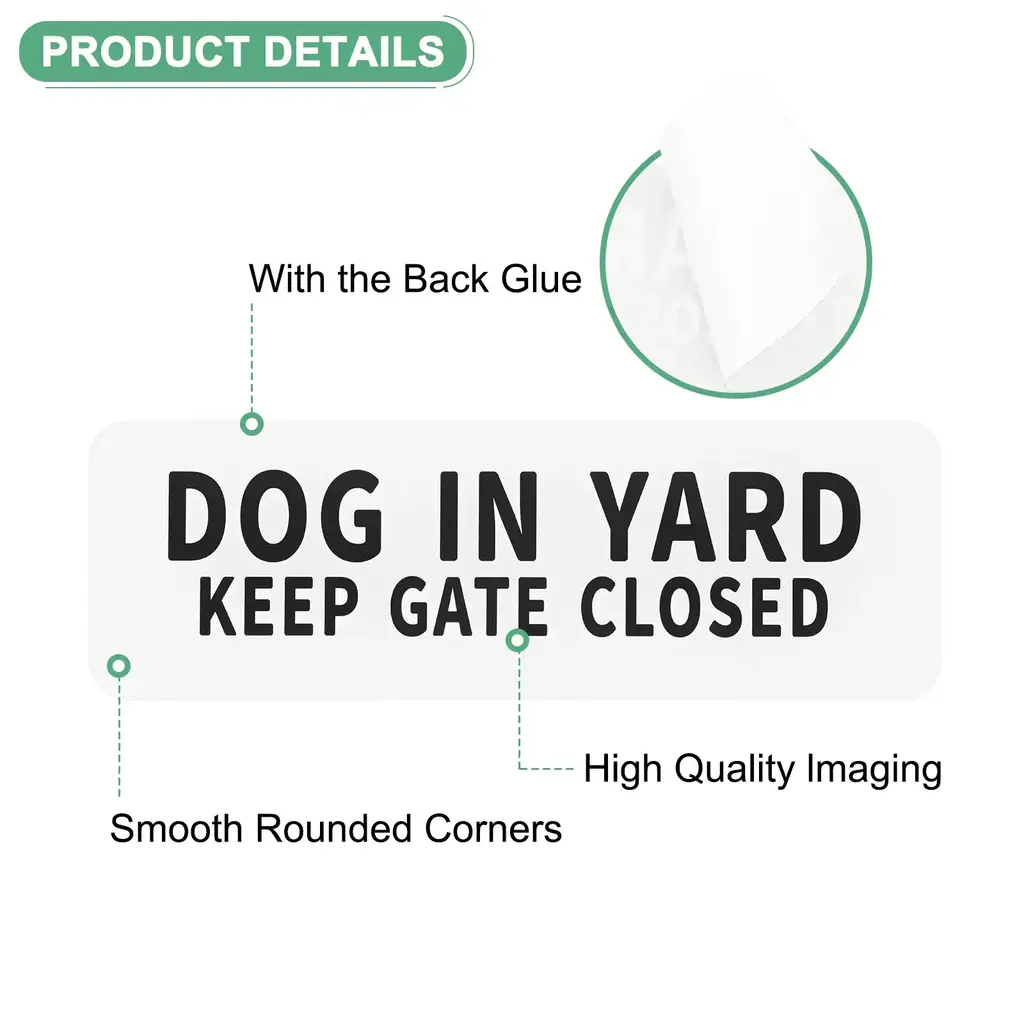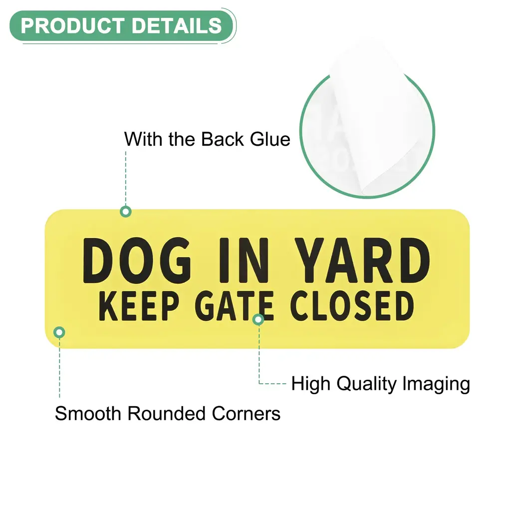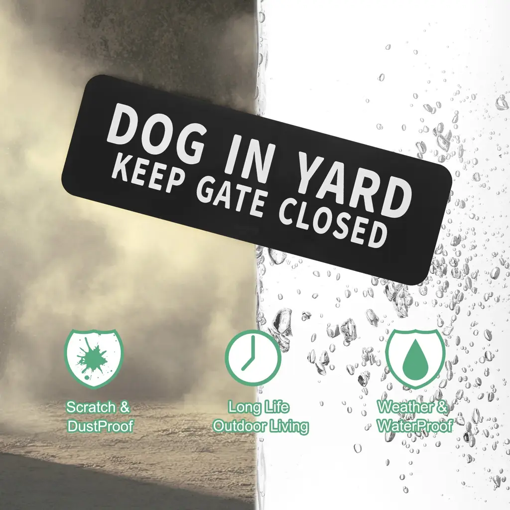 PRODUCT APPLICATIONSThis door sign is universal for various applications. They can be used indoors or outdoors, home, yard, door, etc.PRODUCT DETAILS & INCLUDE√ Material: Acrylic with adhesive backing√ Color: White Letters On Black Background√ Diameter: 9x3 Inch(L*W); Height: 4.5mm/0.18 Inch √ Package Includes: 1-Pack x Dog in Yard Keep Gate Closed for HomePRODUCT ADVANTAGES1. Dog signs are made of acrylic, which is durable, anti-rust, and waterproof, it has good wear resistance and can be used for a long time.2. This yard sign has the back glue, and rounded corners designed for easier installation, that is, tear and stick. Alerts some people, couriers, and visitors to the presence of a dog in the yard, ensuring safety for both pets and people.ATTENTIONBecause of the light, the color and size will be slightly wrong.