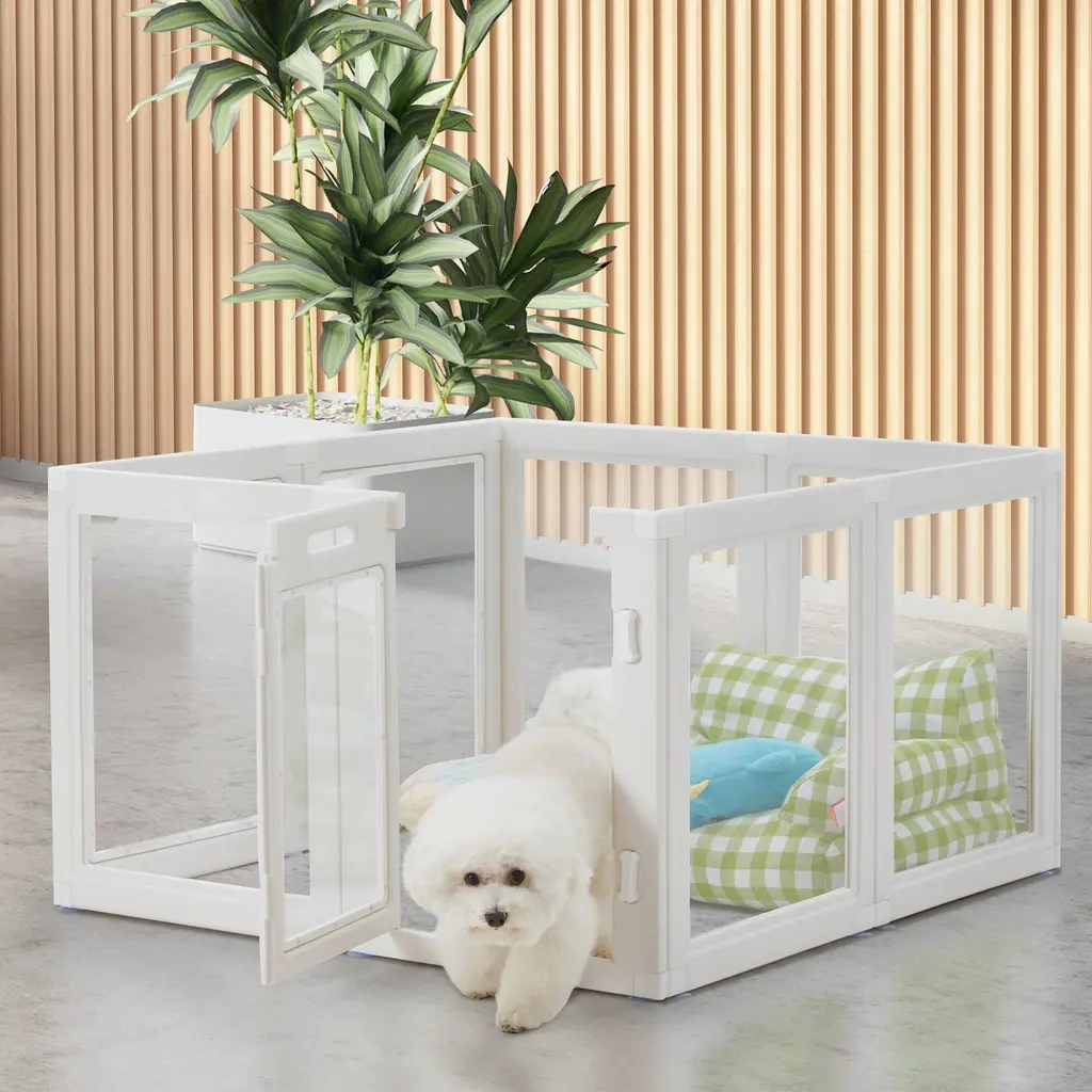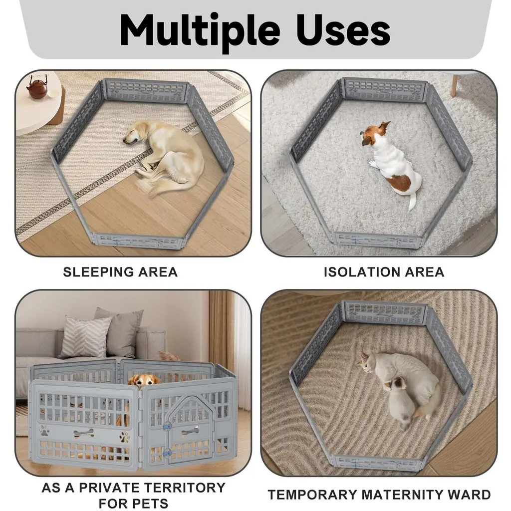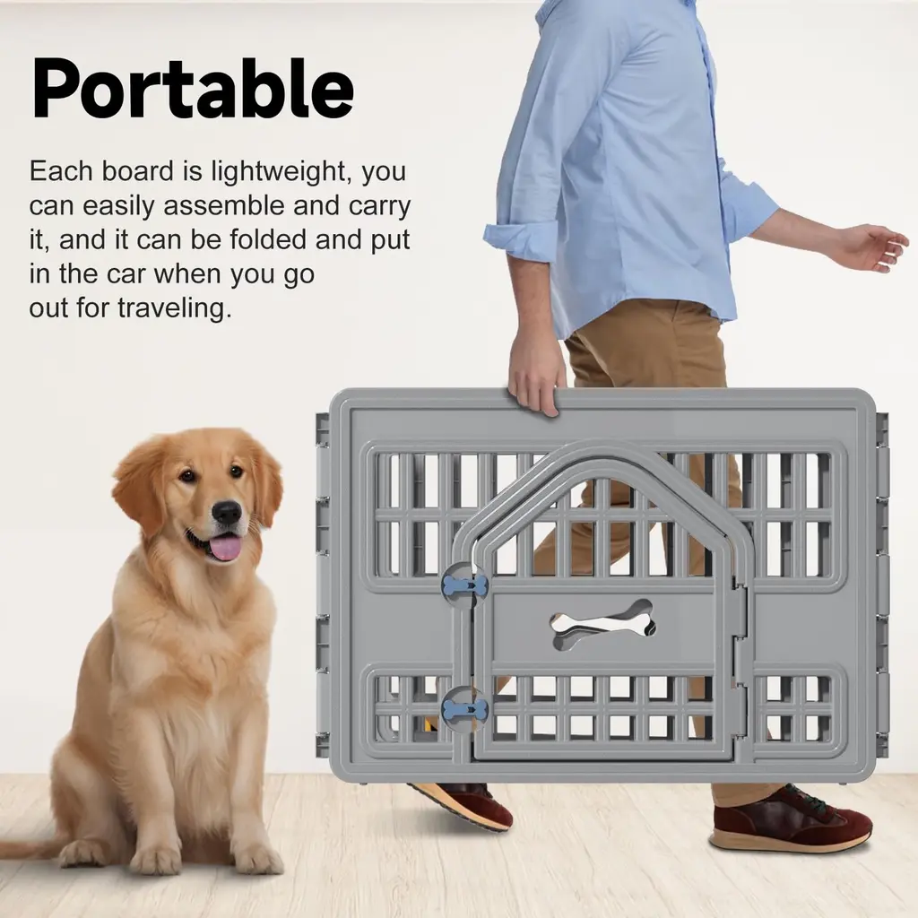 DURABLE - This playpen is made with durable, heavy-duty molded plastic and ready for playtime both indoors and out. The material is easy to clean and additional panels can be ordered so the playpen can expand to grow with your puppy or pet and give them more room to roam. EASY ENTRY - Save yourself from having to hoist up your pet every time you want to take them out of or put them into the playpen thanks to the door that's built into the front panel and perfectly sized to your extra small to medium sized pet such as puppies, cats, chihuahuas, dachshunds, pugs, and other family pets. EASY ASSEMBLY - Built with convenience in mind, the pet playpen can be put together easily by snapping the panels into place. It comes with 5 non-door panels and 1 panel with a door, each panel featuring rubber feet to protect flooring and keep the pet pen in place. GREAT SIZE - Dimensions: 60.75"L x 60.75"W x 23.75"H