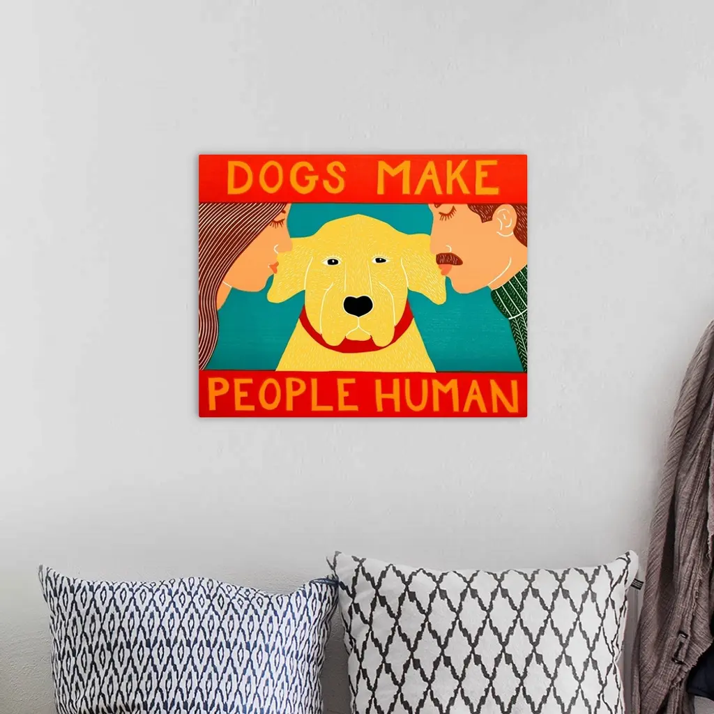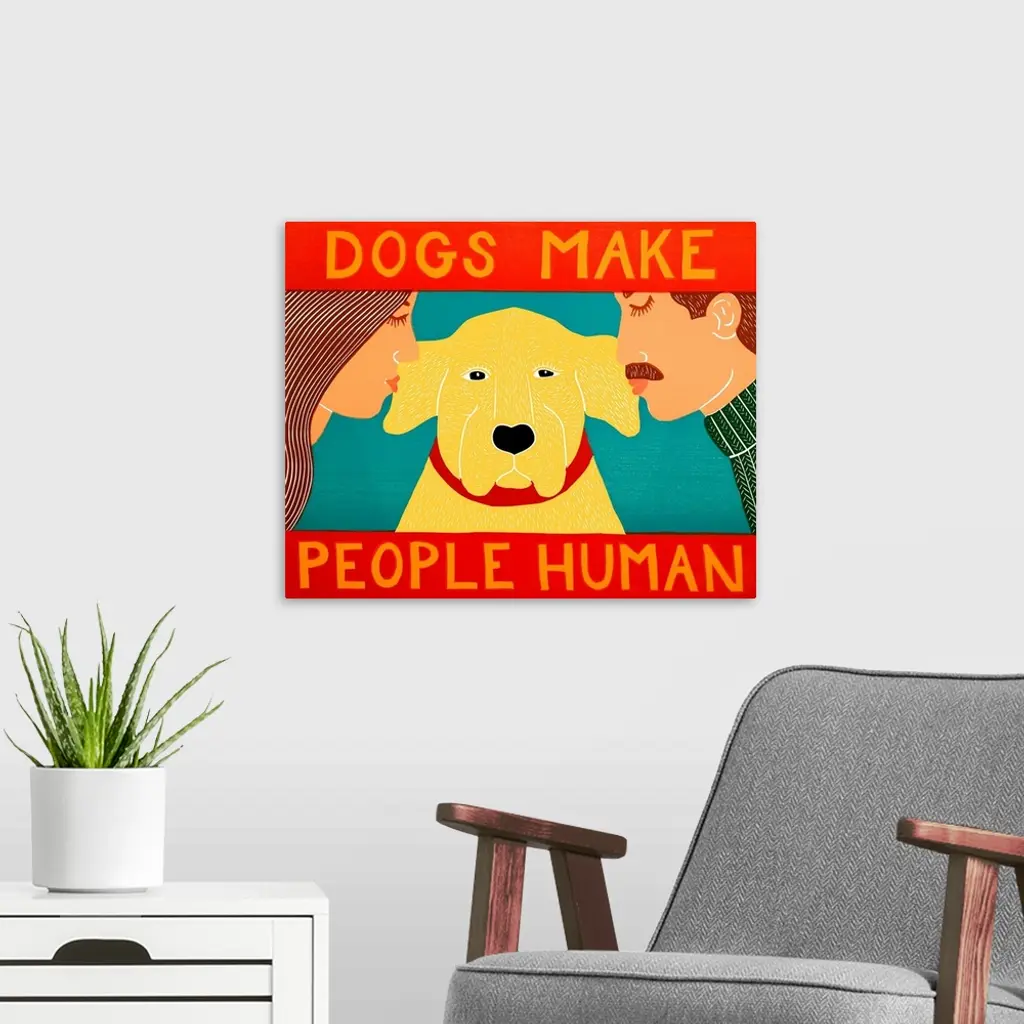 Illustration of a man and a woman kissing their yellow lab on each ear with the phrase "Dogs Make People Human" written above and below them.