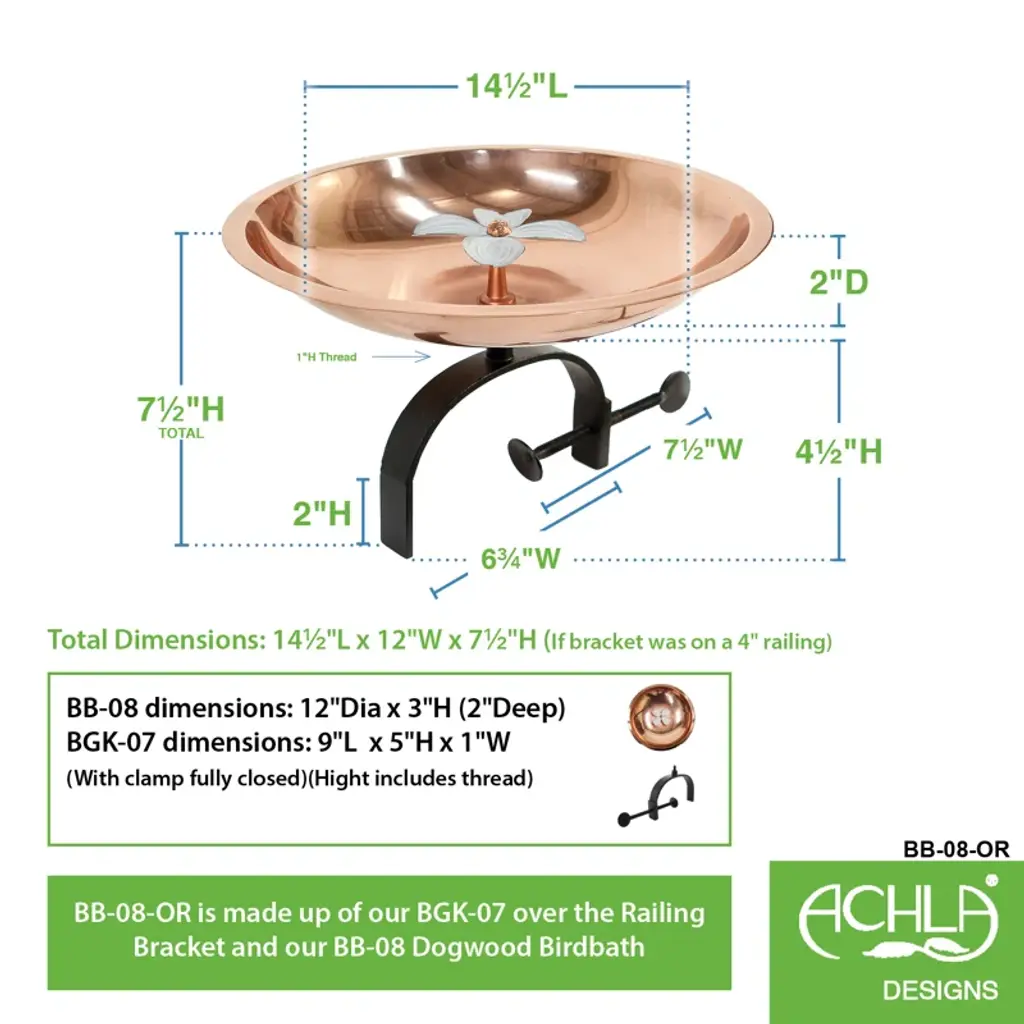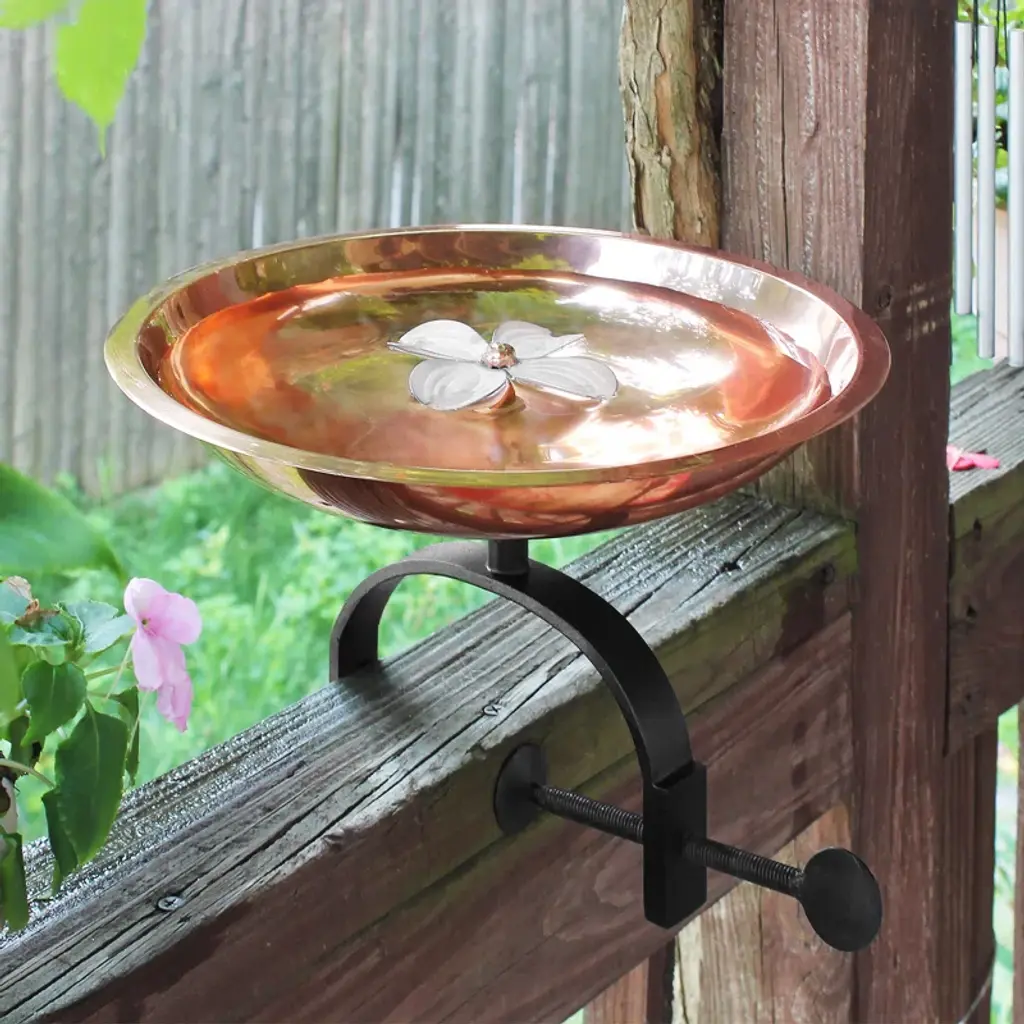 This birdbath was specifically designed with our pollinator friends in mind. The simple copper bowl has a white Anitra flower that fits into the center. Allowing the petals to dip into the water's surface provides a landing place for bees and butterflies to sip at the edge without falling in. Use it with or without the addition of glass beads or stones. The threaded base on the underside of the bowl attaches it to the center of the bracket. Ideal for porches, balconies, or deck rails, the wrought iron bracket has a C-type clamp that holds the bracket to a deck or handrail without the need for drilling or permanent mounting. Fits over railings up to 5 1/2" wide and is designed with ample clearance for a curved top handrail.