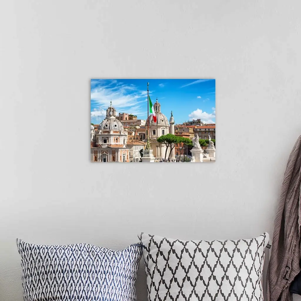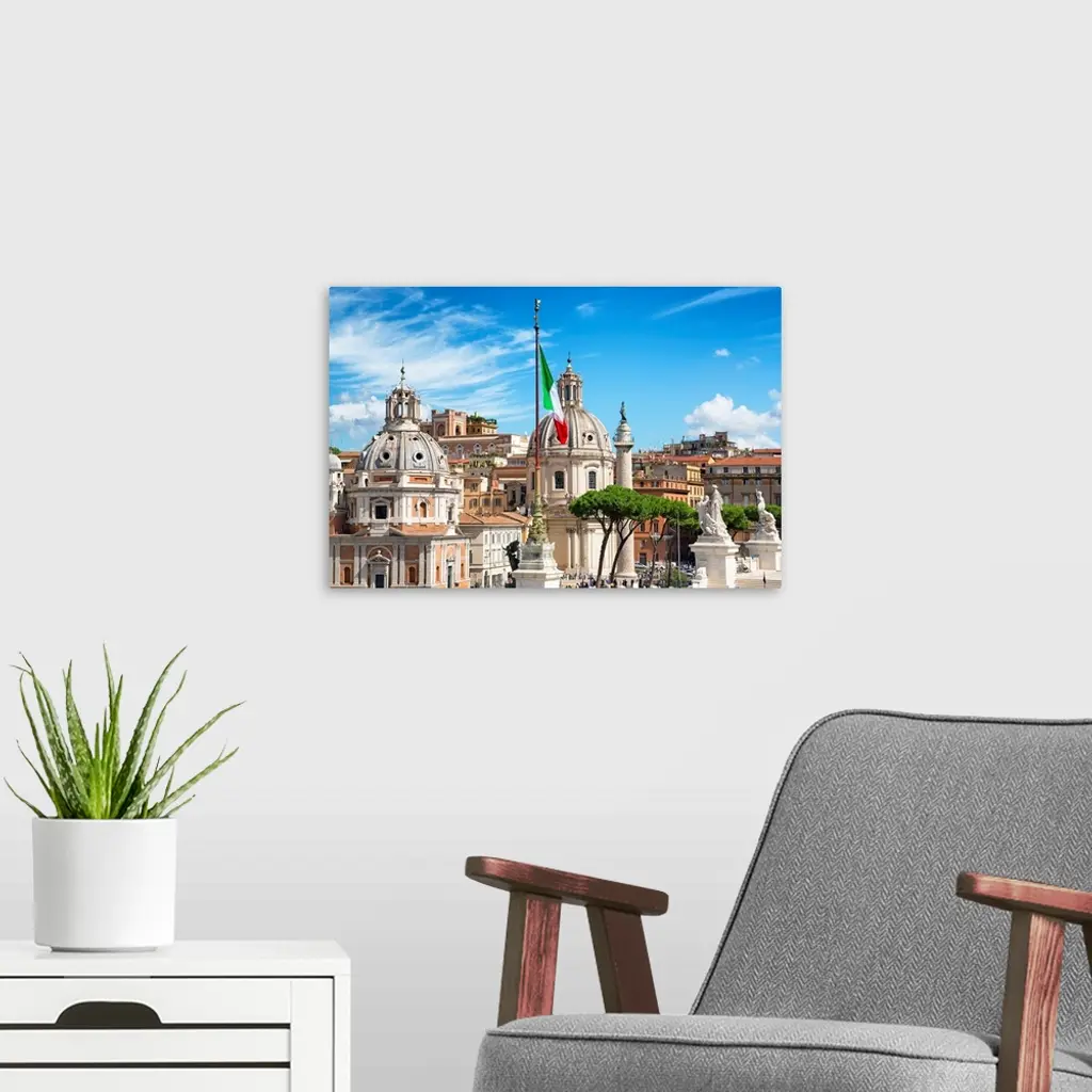 It's a view of the architecture of the city center of Rome with the Italian flag.