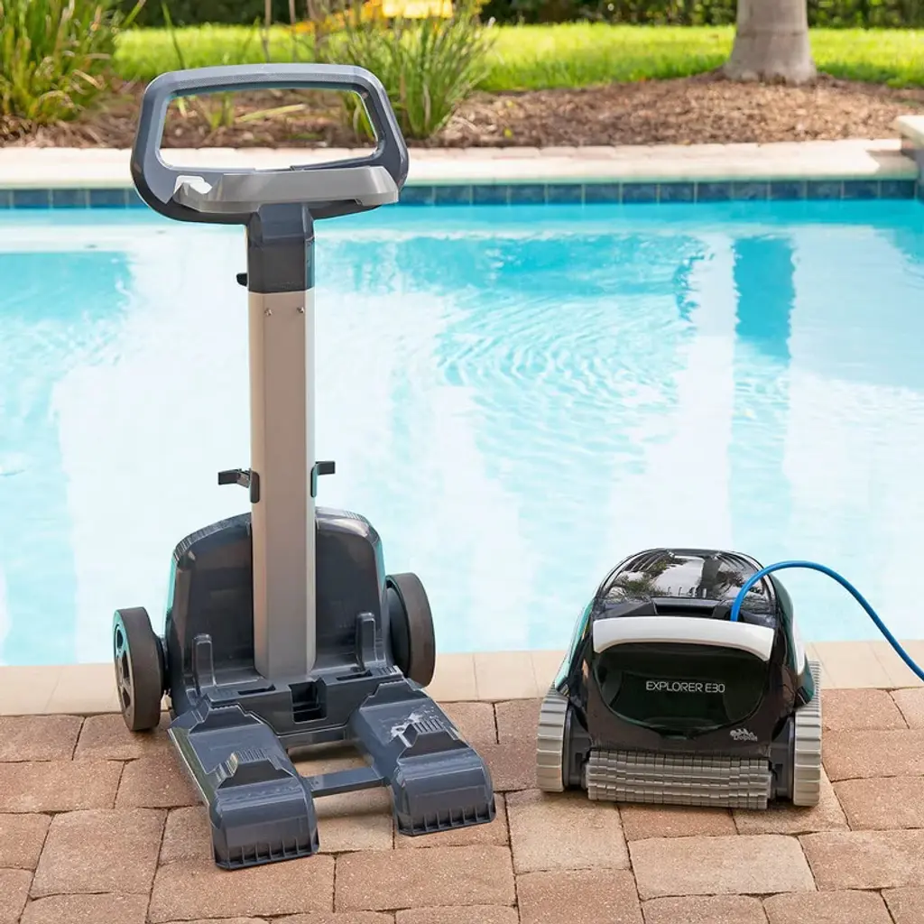 With the Dolphin Explorer E30 robotic pool vacuum cleaner, schedule your pool cleanings from anywhere with always connected Wi-Fi. Keep your pool area organized and make transporting and storing simple with the included Universal Caddy.Easily move and store your Dolphin with the included Universal Caddy. The tangle-free cable holder keeps your robot cable organized, while the Caddy makes it easy to move your Dolphin around the pool area.The Dolphin includes powerful wall climbing capabilities to scrub the floor, walls, and waterline of your pool.With the Dolphin's PowerStream technology, your pool surface gets incredibly clean. As the cleaner moves vertically up the wall, water is propelled out in multiple directions creating a constant grip. Each performance cleaning gives you an exceptional pool experience with less work.Dolphin pool cleaners have been effortlessly cleaning the world’s pools for over 35 years, empowering pool owners with hassle-free pool maintenance solutions. With unmatched performance, durability, and cost savings, all our Dolphin products help you get back to what matters in life — enjoying your pool with family and friends.Dolphin Explorer E30 Robotic Pool Vacuum Cleaner with Wi-Fi Control — Included Universal Caddy for No-Hassle Storage — Ideal for All Pool Types up to 50 FT in Length. Provides an ultimate clean by scrubbing your pool floor and walls. Its ideal for all pools, an ultimate clean no matter your pool shape or surface type. People love their Dolphins, the best thing you'll ever buy for your pool!