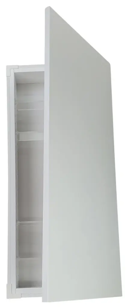 Perfect for any bathroom. Recesses in the wall between the studs, and simply screws to the studs on each side of the opening. Only the door is outside the wall. Fully adjustable glass shelves inside. Our unique, patented design of shelf supports keeps each shelf in place. Concealed hinges with soft close built in assuring the door will never slam shut but softly close on its own instead. The box is SOLID pine and the Slab panel style door is MDF. We''ve painted the inside of the box white, so you don''t have to! The box is 3.5" deep inside and gives you plenty of usable depth, but fits in standard 2x4 walls. Cabinet box is 12.5" wide inside. The door is reversible to open either Left or Right. Completely assembled! All you need to do is put one screw in each hinge to mount the door. Then insert it into the wall and screw it to the studs with included screws. If you are replacing a current cabinet, measure your wall opening! White plastic trim surround covers the rough edges of your opening up to 1/2" all around. Door covers the trim surround when closed so the only thing you see outside the wall is the door itself. White plastic trim surround covers the rough edges of your opening up to 1/2" all around. The door covers the trim surround when closed so the only thing you see outside the wall is the door itself. Made in Sarasota, FL. Motion sense battery-operated LED light kit included. Just open the door and the light comes on. Close the door and the light goes off. Perfect in the middle of the night so you won''t wake your partner! The door comes in two variants: White enamel and primed gray, which is ready to be painted.