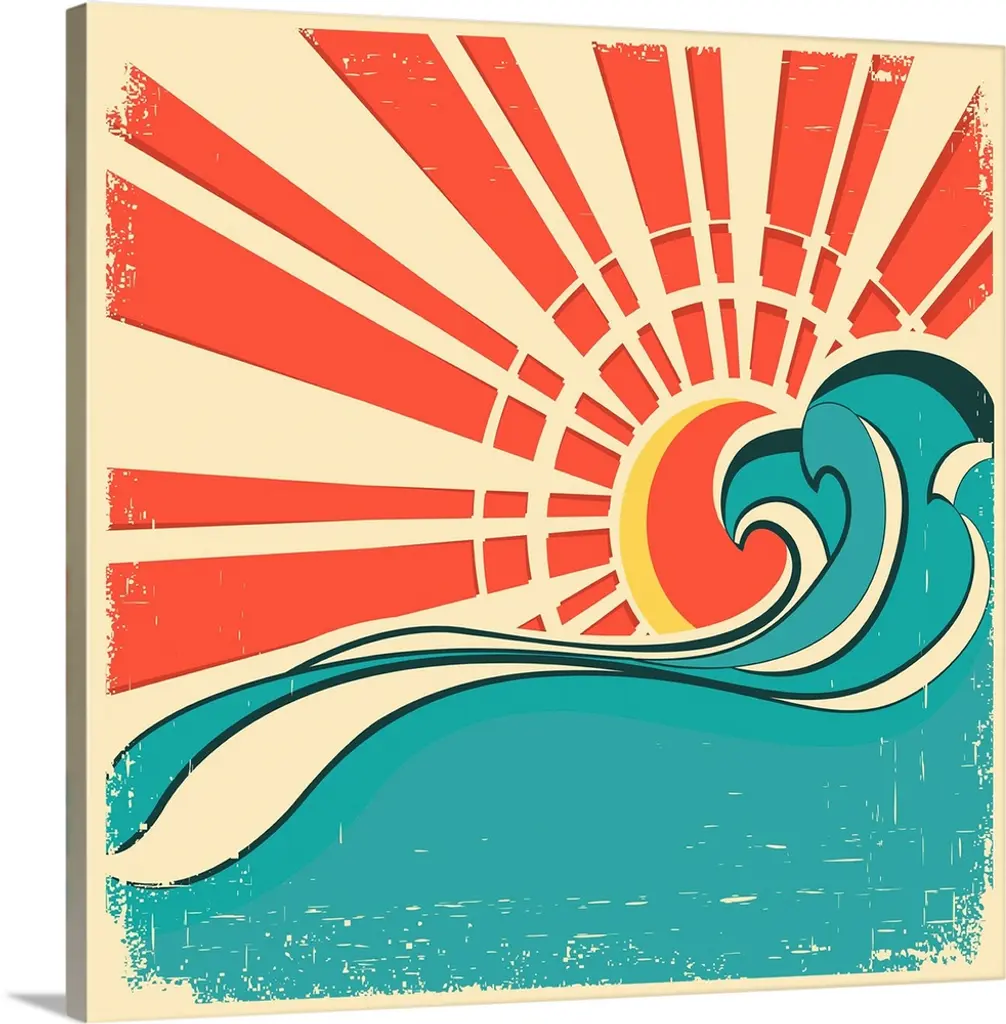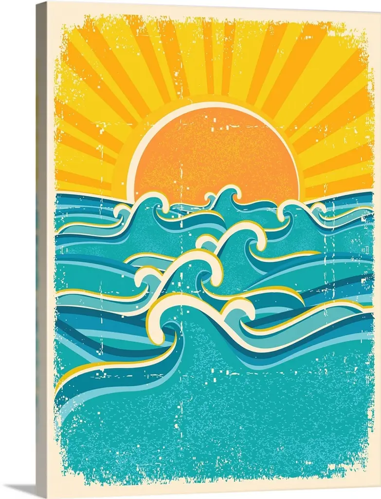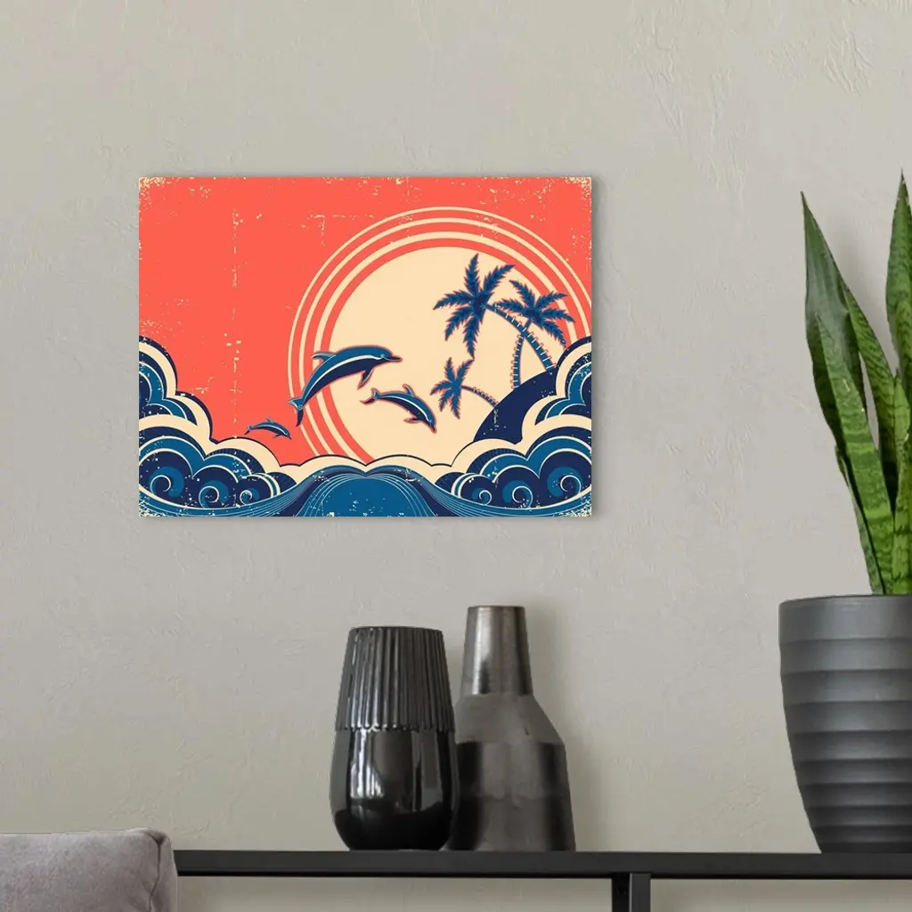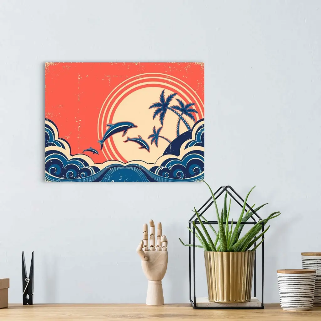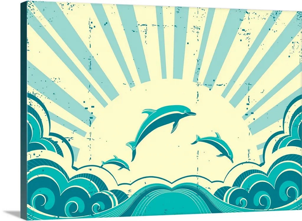 Seascape Waves Poster With Dolphins. Vector Grunge Illustration On Old Paper
