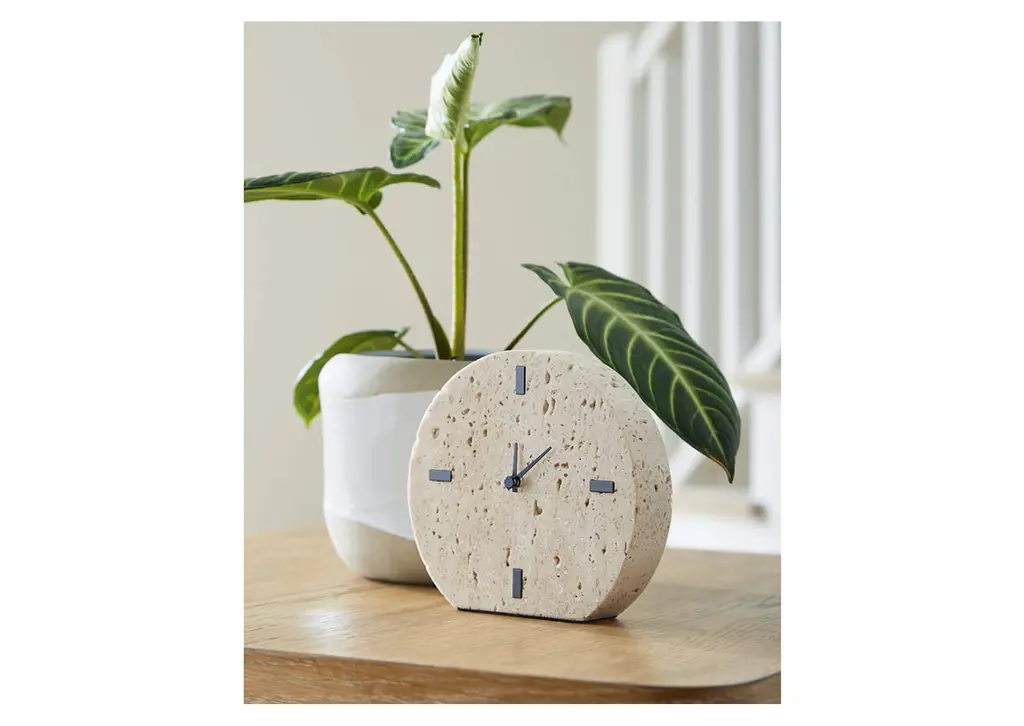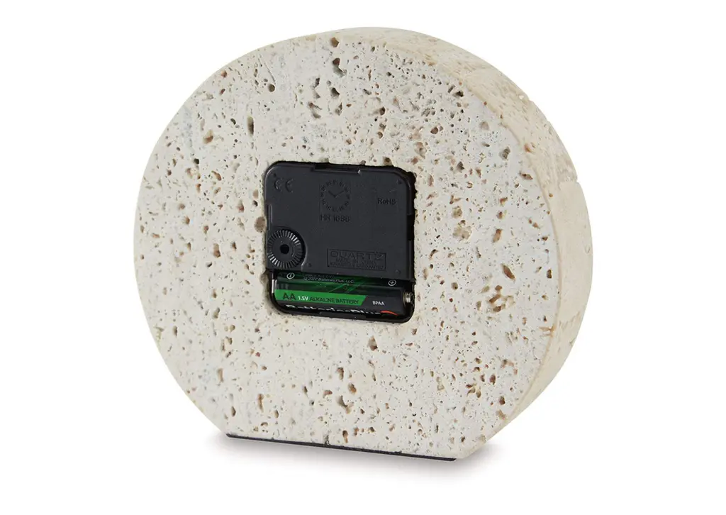 Take note of the time in contemporary style. Crafted from beige travertine, the Donfordson clock is sure to lend minimalist flair to shelves and tabletops. Black accents provide a dramatic contrast to the earthy sensibility of this simple-yet-sophisticated timepiece. Weight 9.000 lbs. (4.05kgs.)