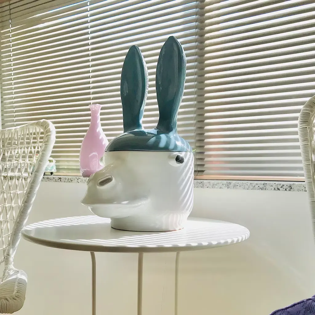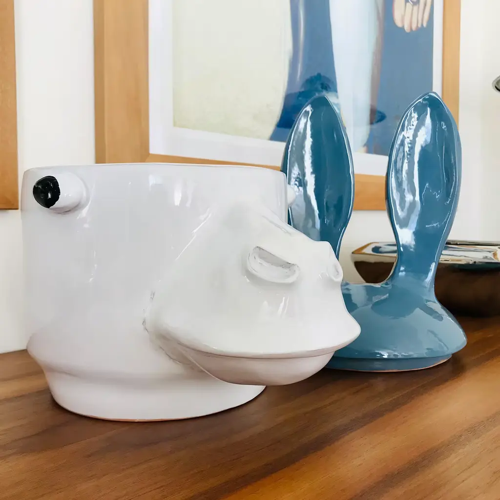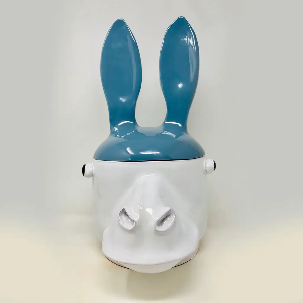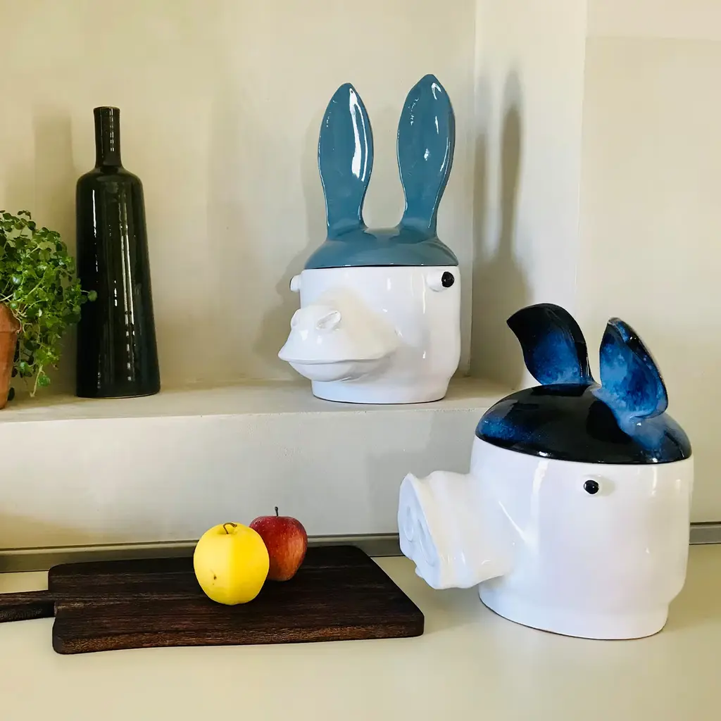 Shaped like a donkey's head achieved using the coiling technique, this container is sure to bring an eccentric twist to restrained modern homes. The luminous white glaze on the vessel - snout included - and the vivid blue one characterizing the lid with ears-shaped handles result from a firing at 930° (majolica method) following the first firing at 960° to transform the clay in terracotta. A smaller version is also available, please contact the Concierge for pricing and other colors.