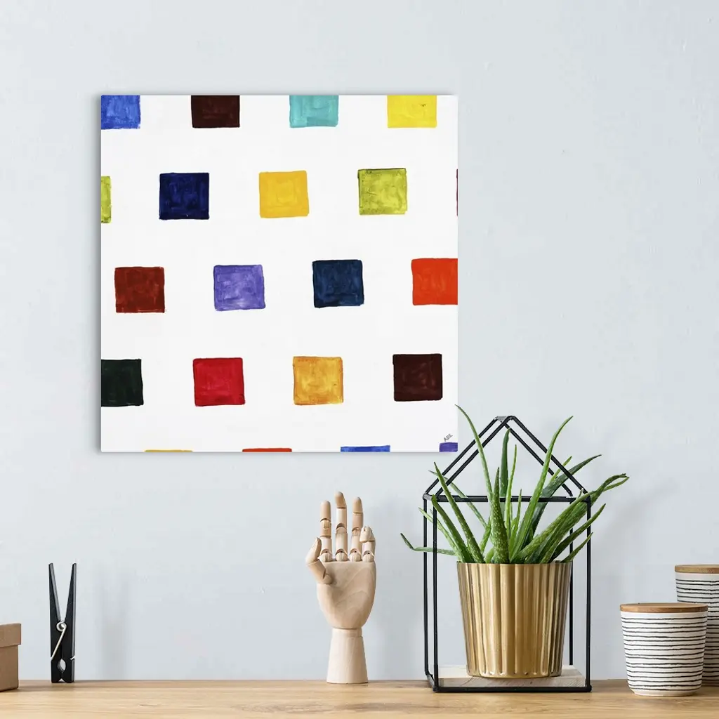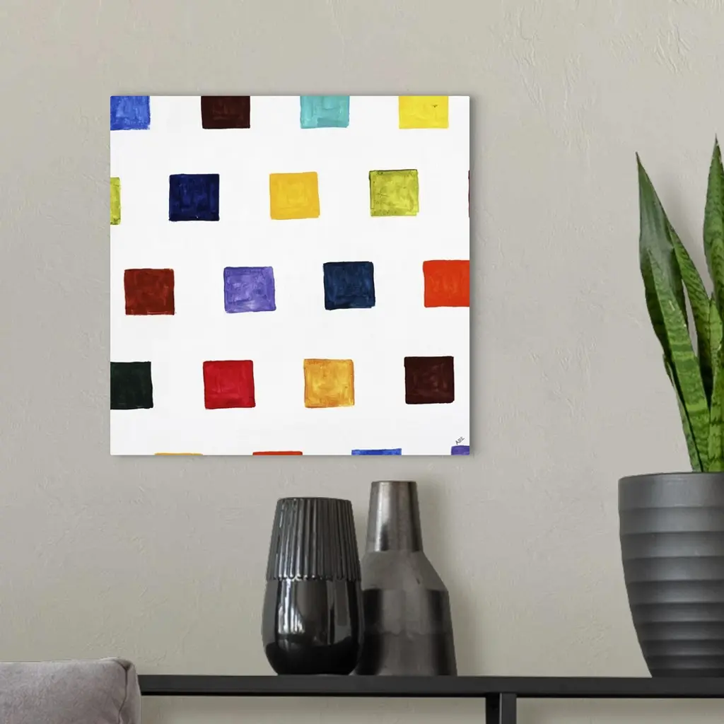 Square abstract art with different colored smaller squares in rows going up and down the canvas.