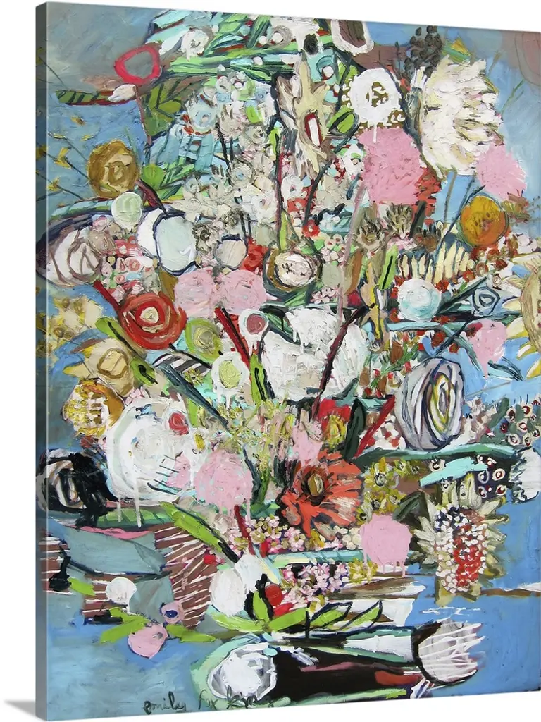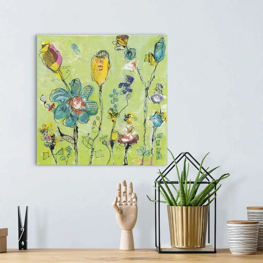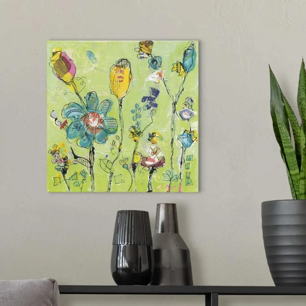 Blue and yellow abstract wildflowers on a light green background made with mixed media.